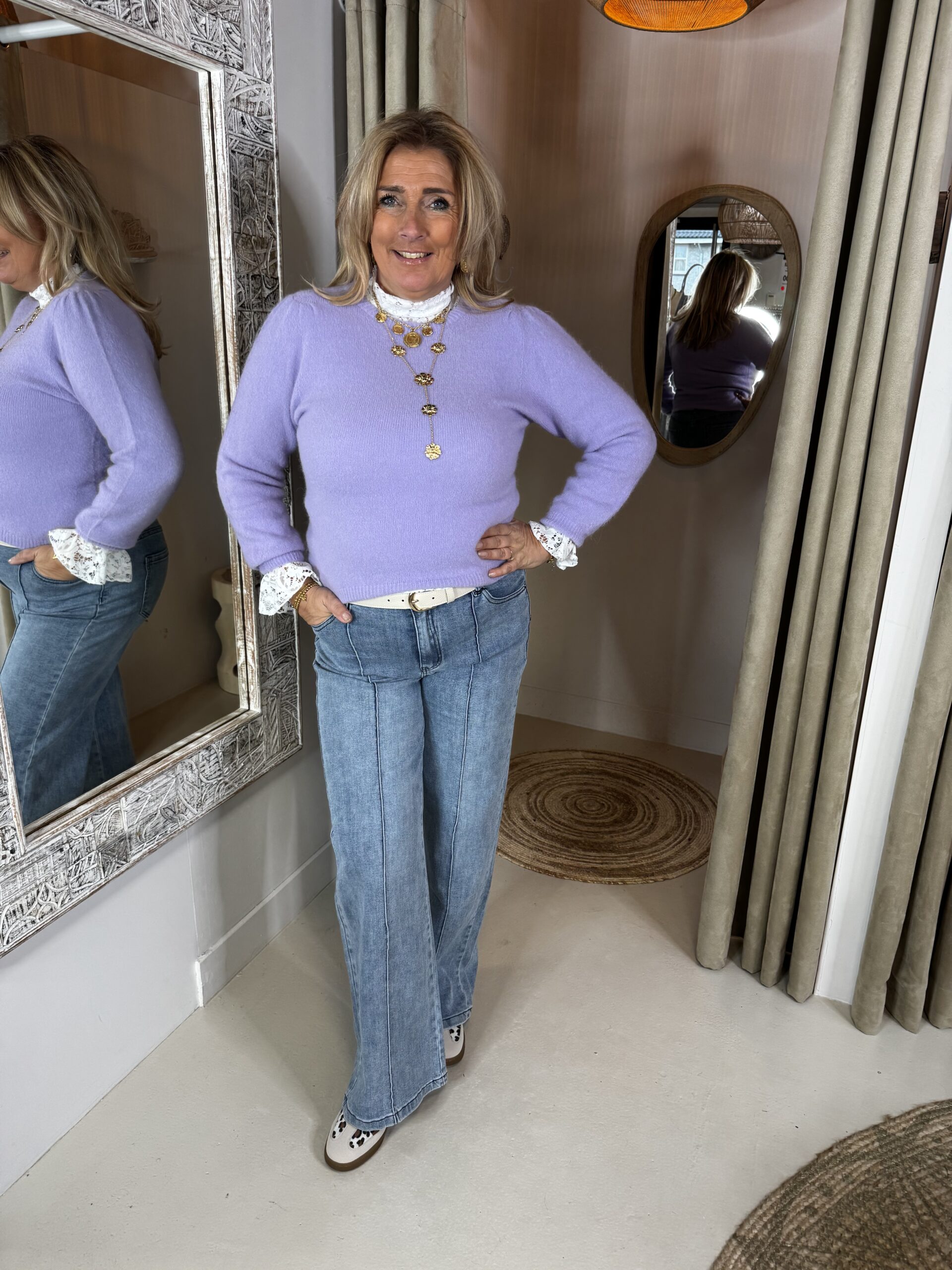 Niet te koud, niet te warm, mooi met een (kanten) top of katoenen blouse eronder, maar ook zo los goed te dragen