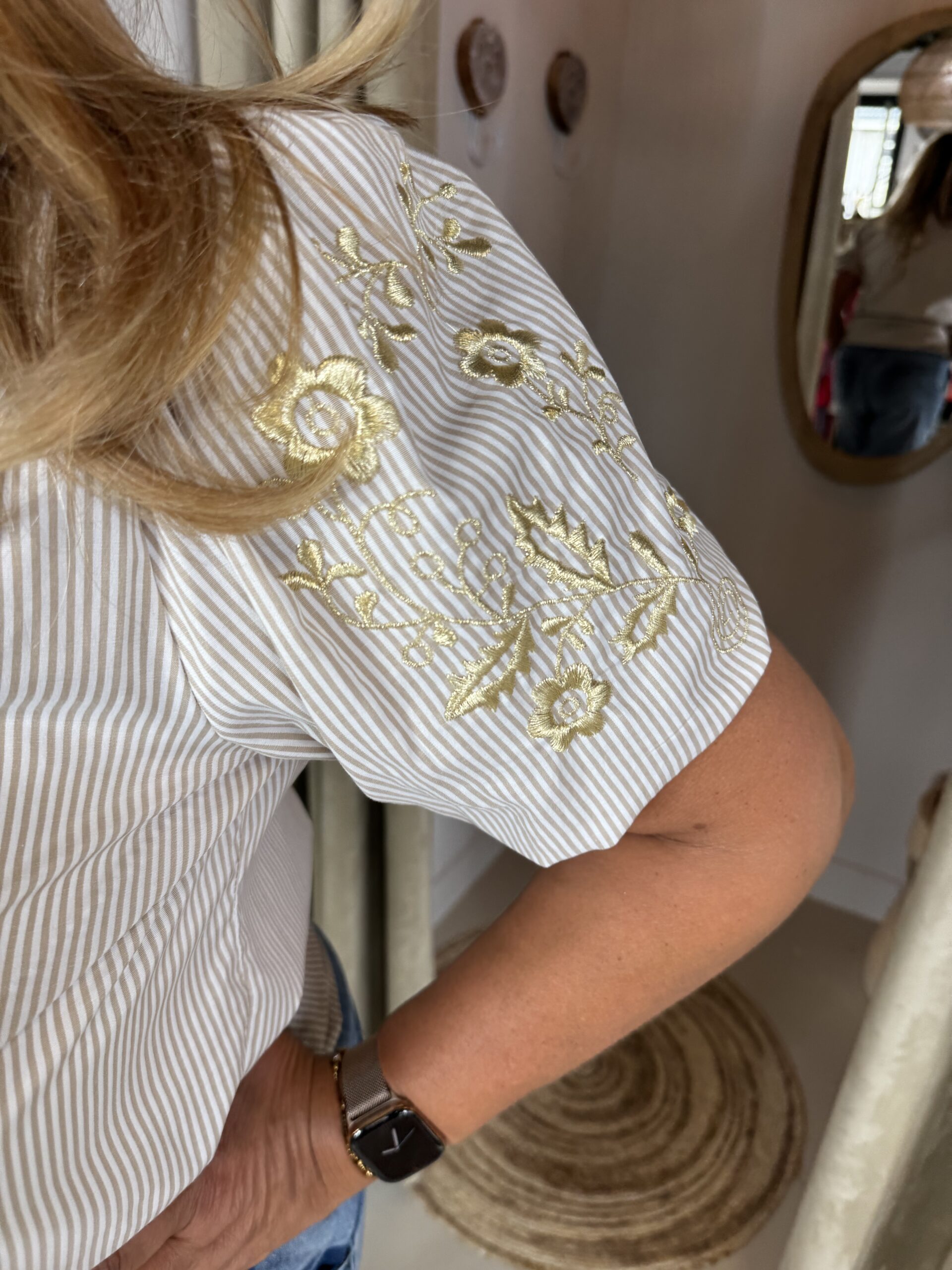 Blouse Maaike heeft leuke borduursels op de mouwen in goud