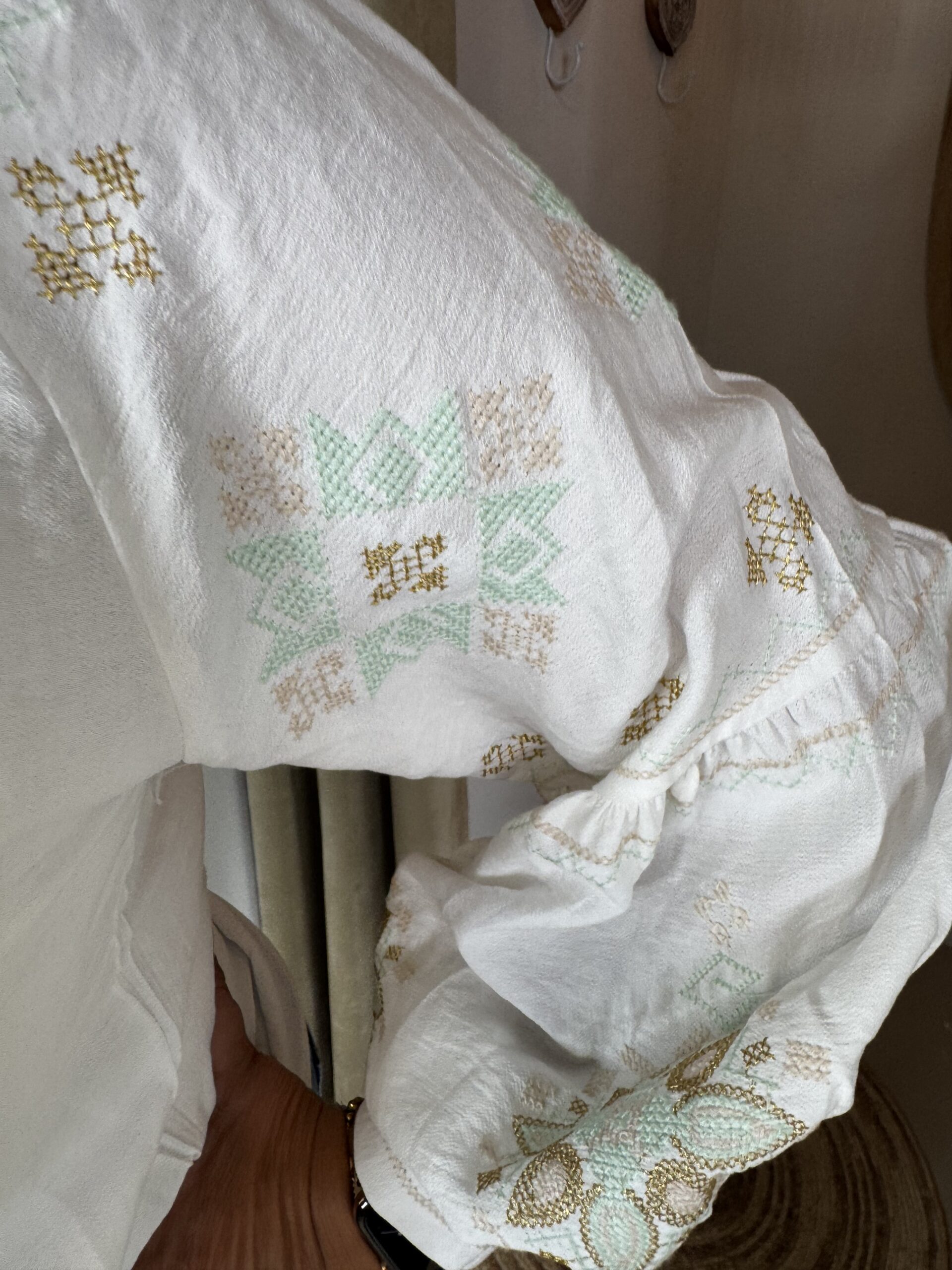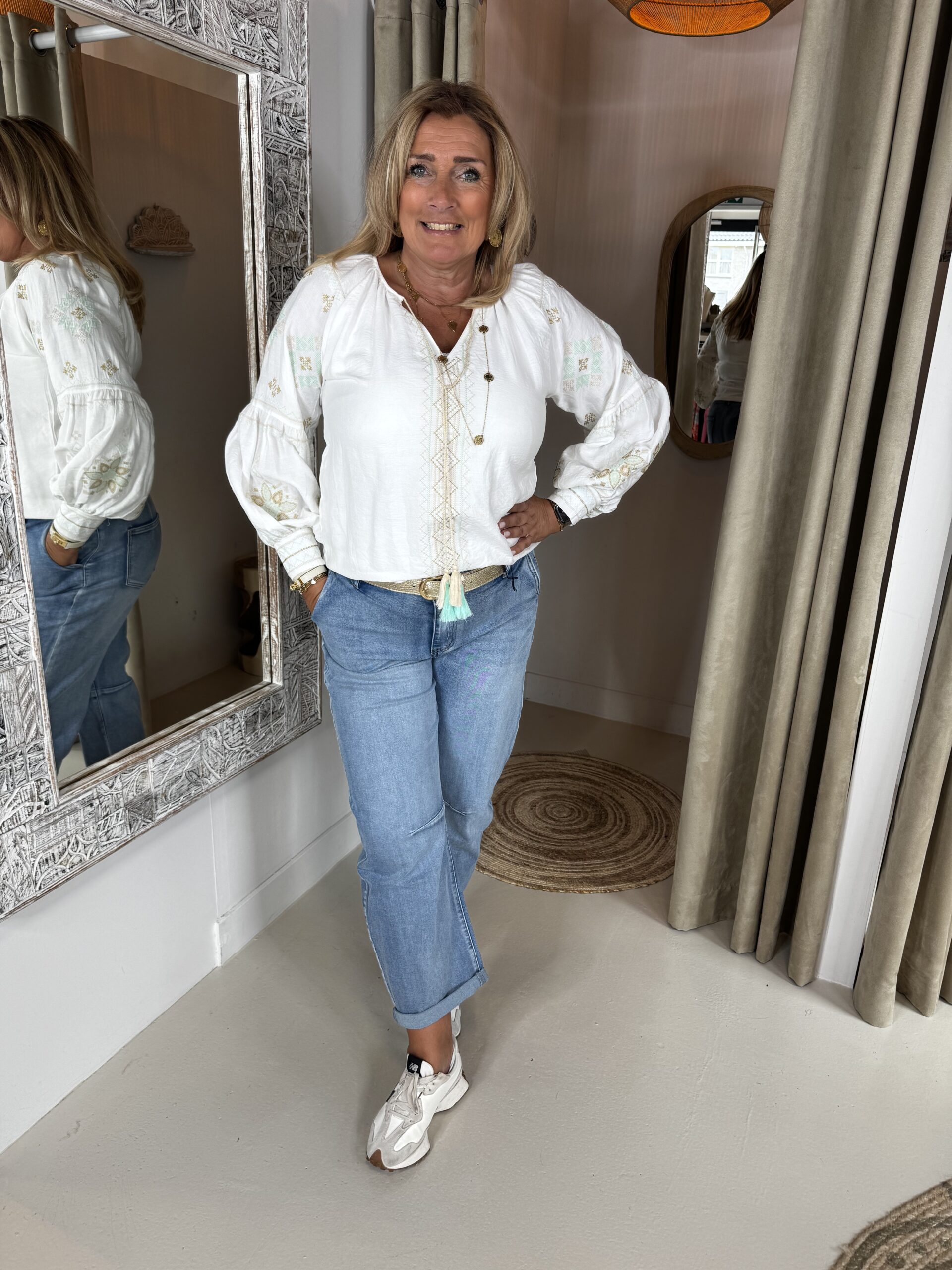 Blouse Nuela 66758 White/Green is een blouse met vrolijke zacht gekleurde borduursels in zand, zacht groen en goud