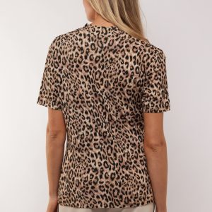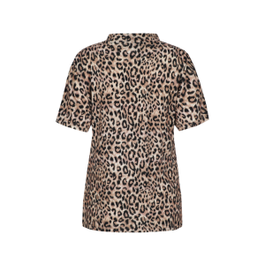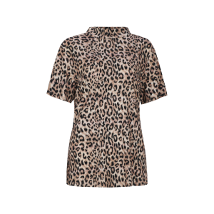 De opstaande hals en korte mouwen zorgen voor een verzorgde look, terwijl de leopardprint een moderne twist geeft.