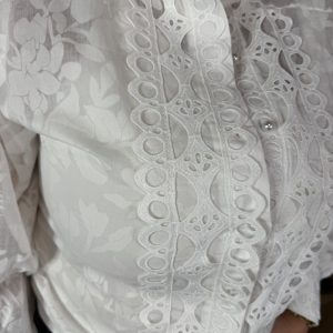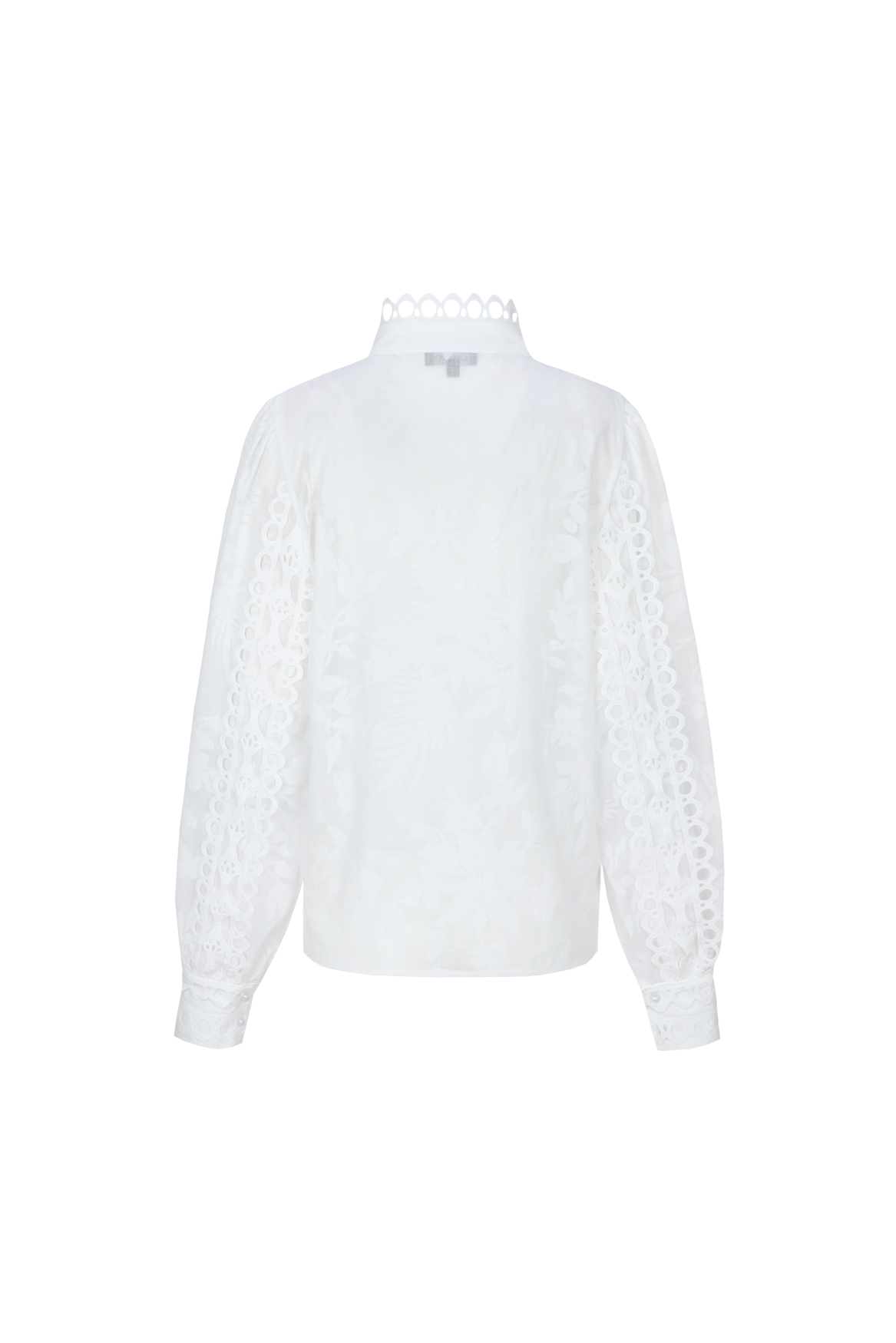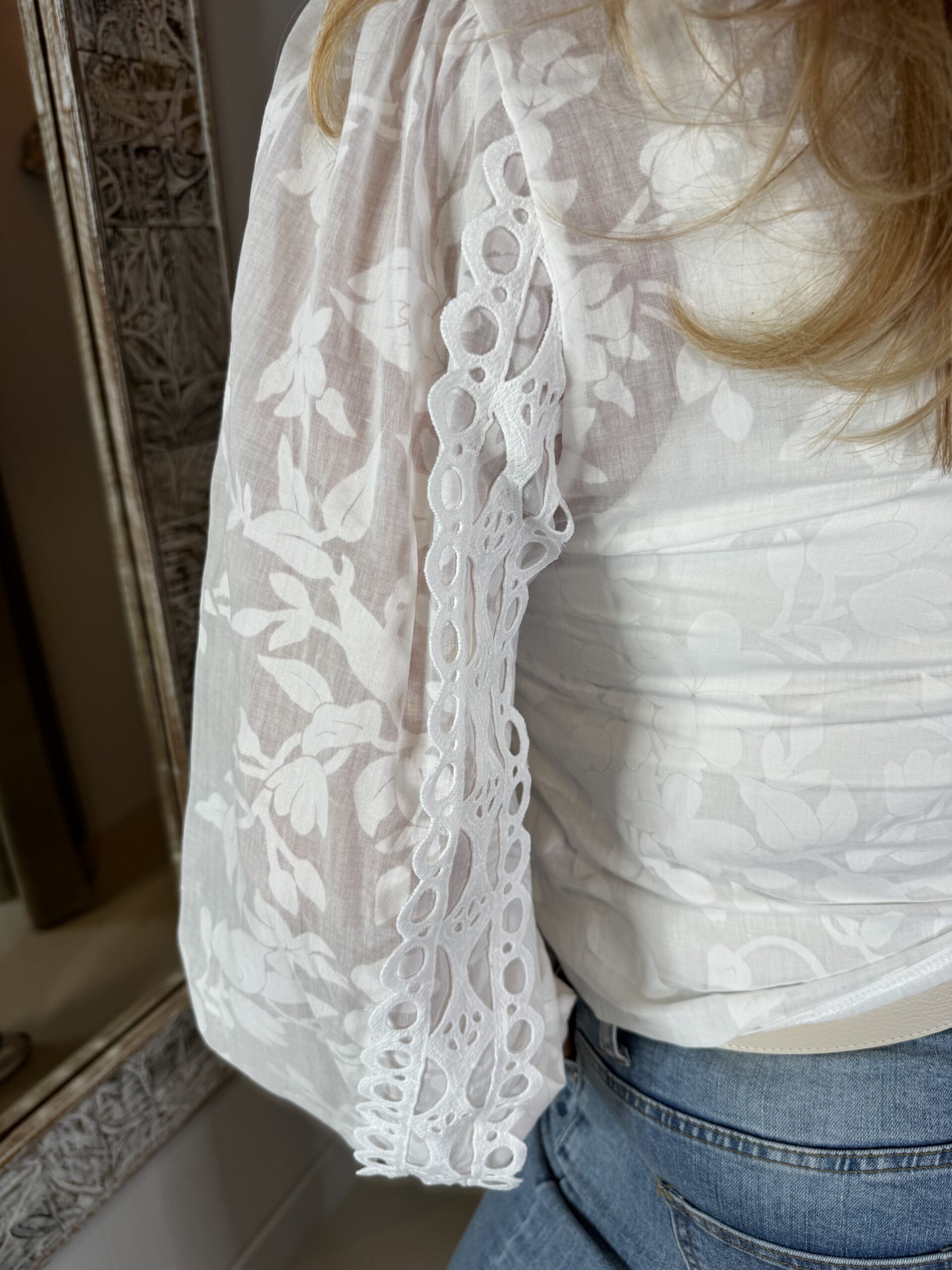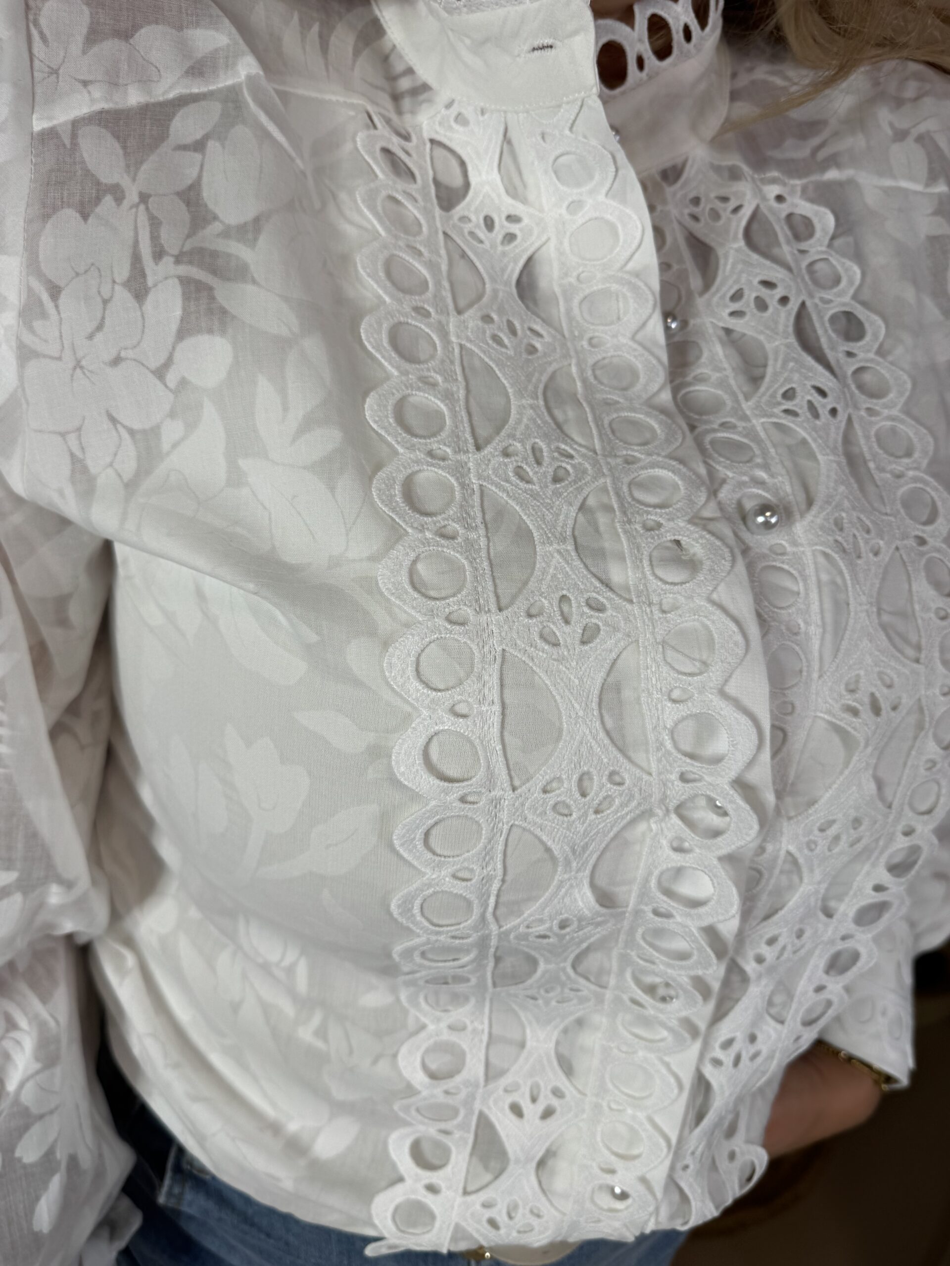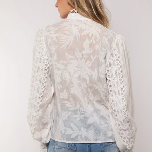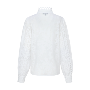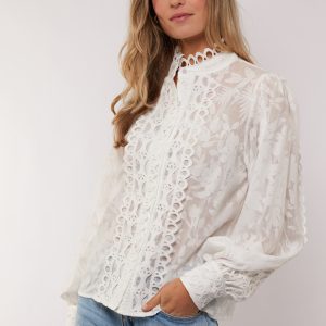 De opstaande kraag en de mooie broderie-details geven de blouse net dat beetje extra, terwijl de licht transparante stof zorgt voor een luchtige uitstraling.