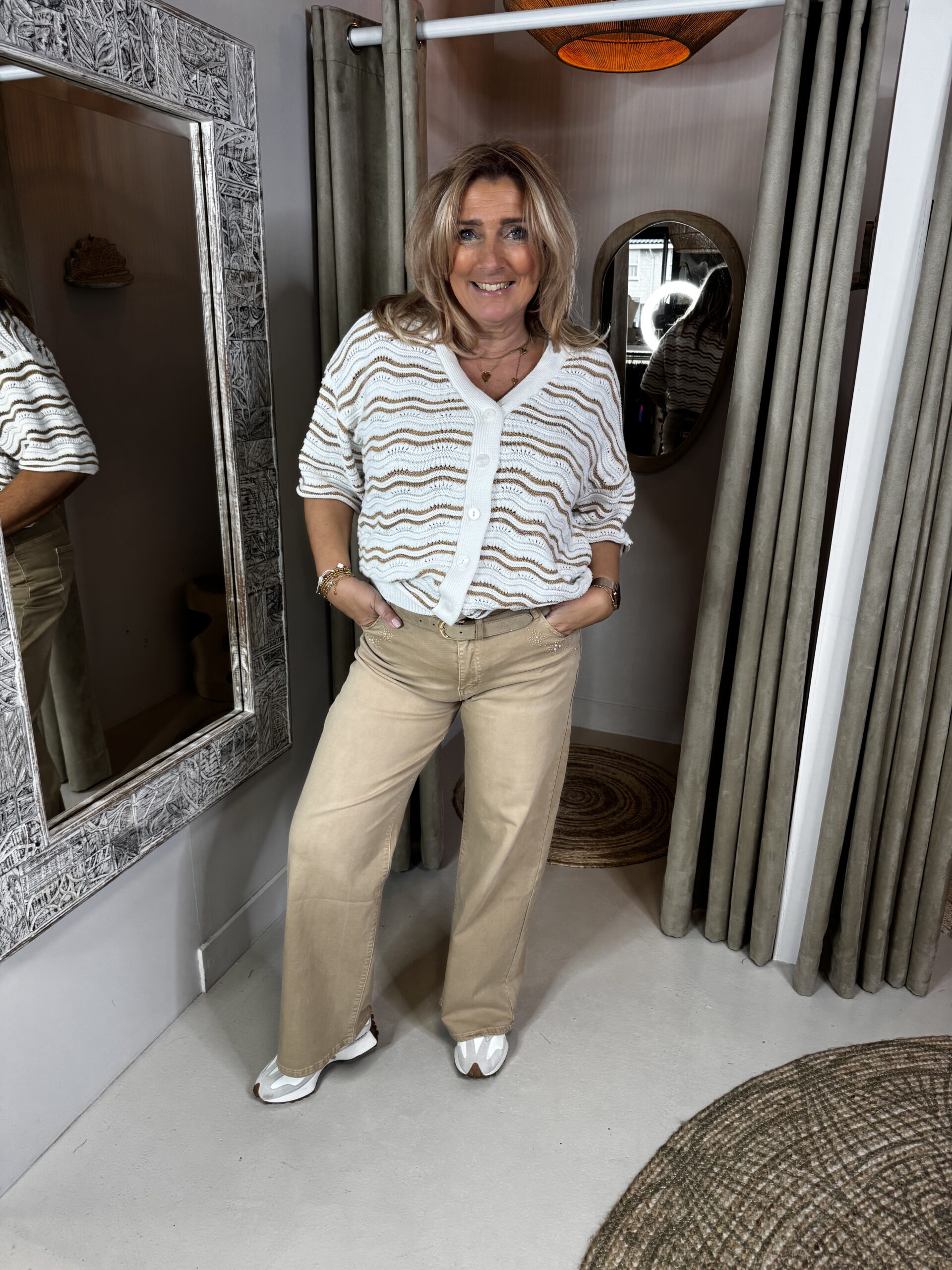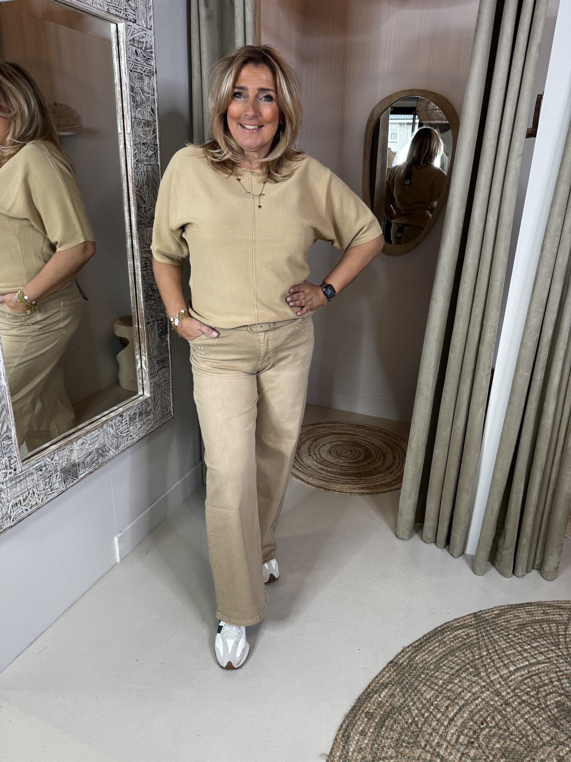 Monique heeft maat 42-44, is 174 en draagt van deze broek de XL