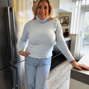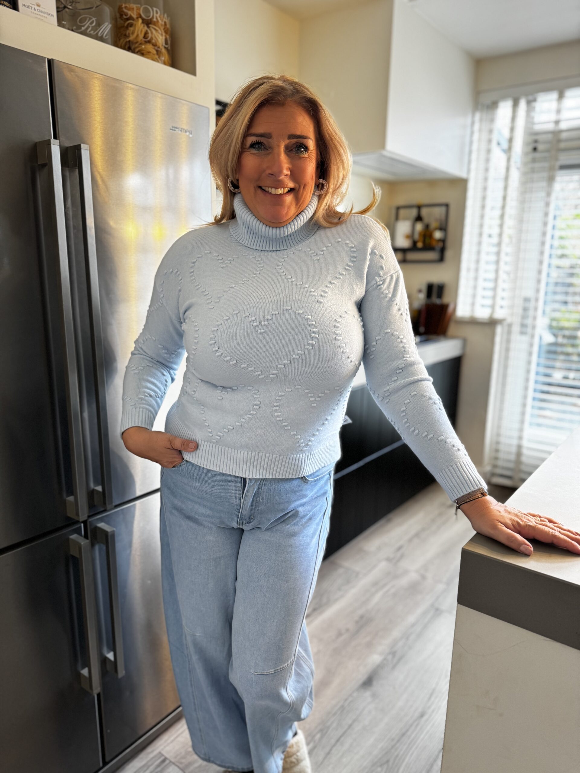 Deze Gebreide Coltrui 9671 met Hartjes Effect Licht Blauw voor dames is gemaakt in een heerlijk zacht breisel.