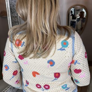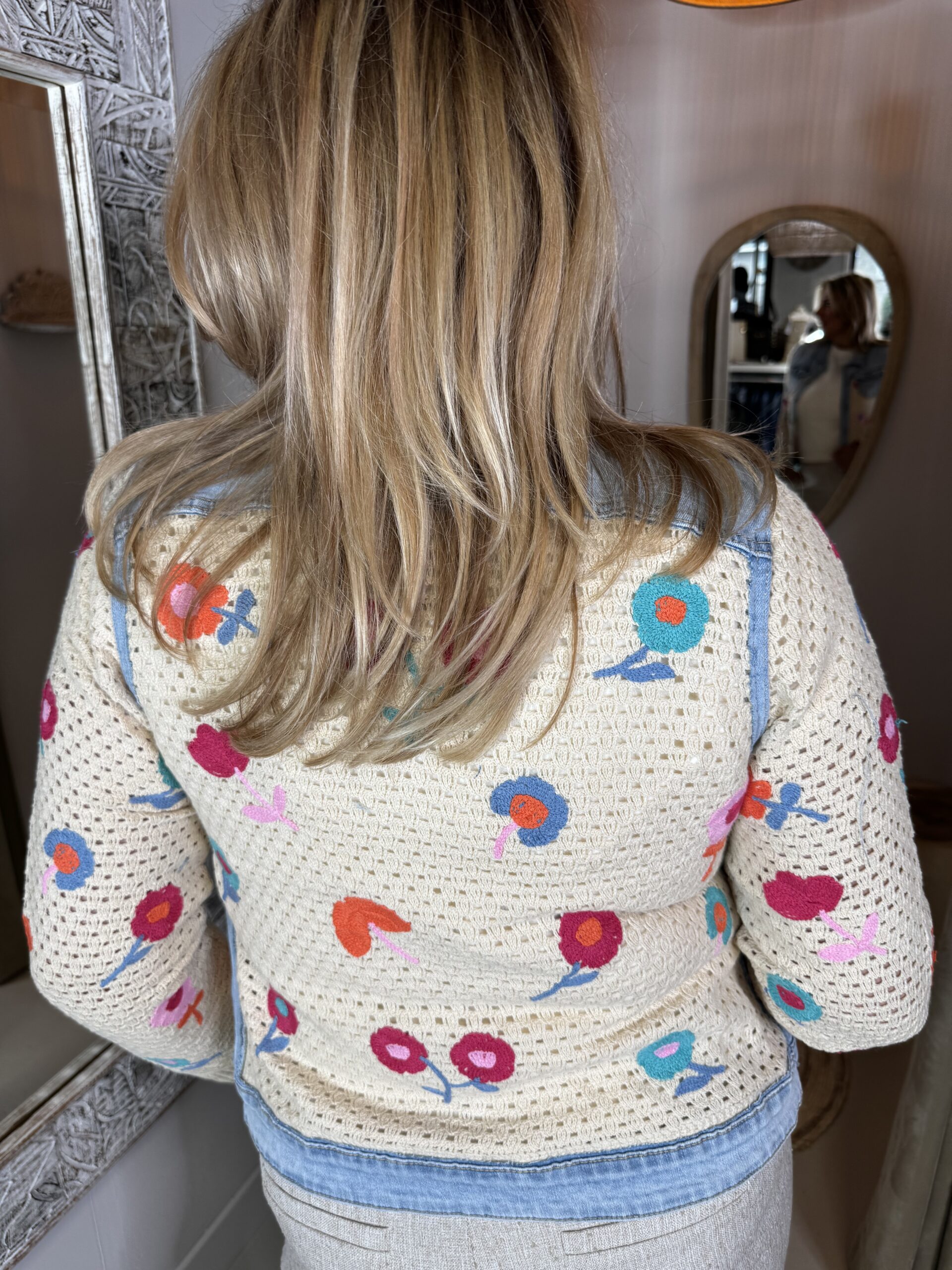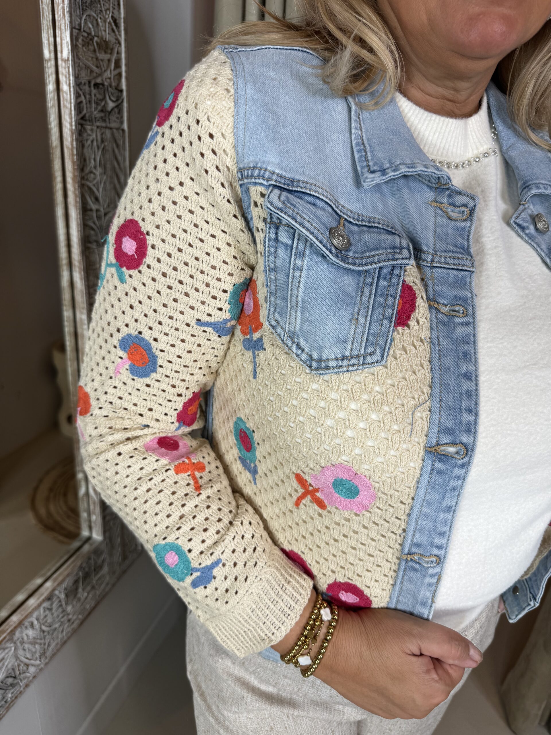 Dit super leuke getailleerde spijkerjasje is voorzien van hele gave gebreide mouwen en applicaties op het jasje