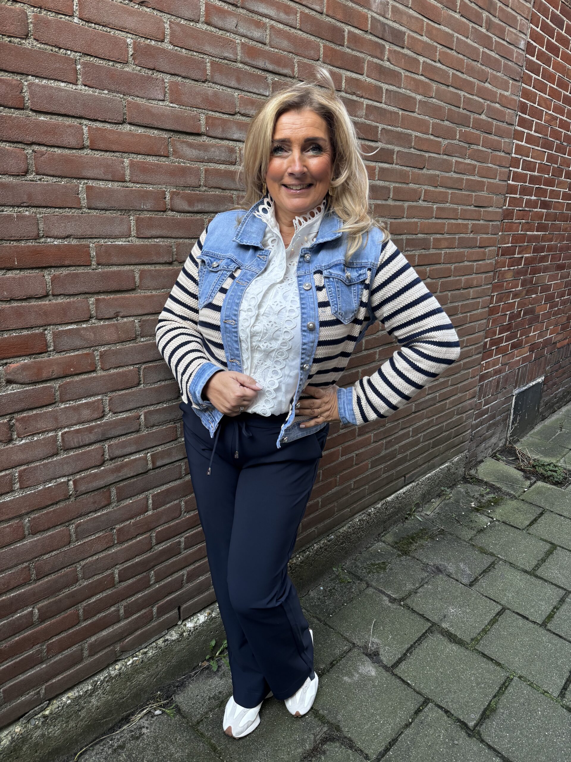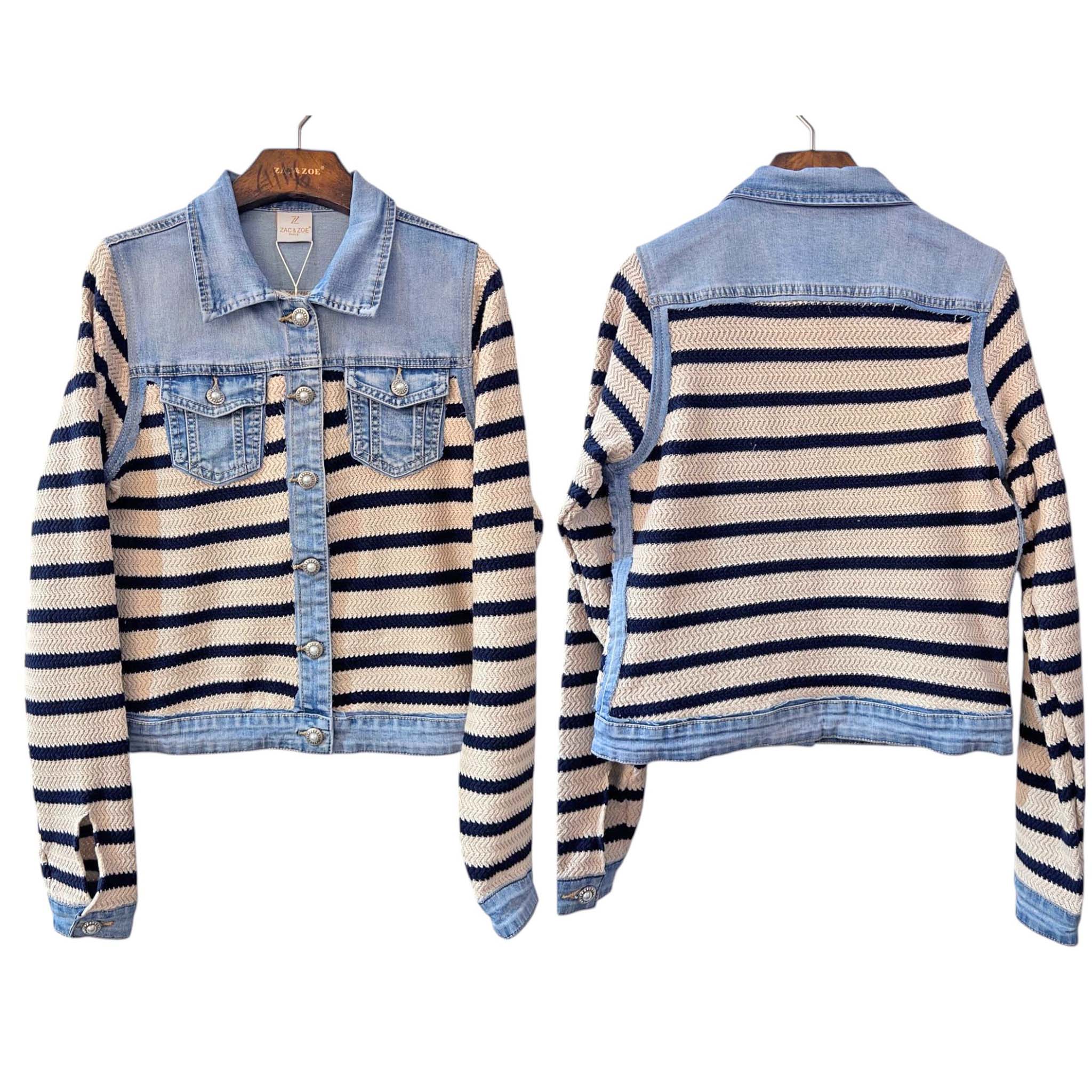 Dit super leuke getailleerde spijkerjasje is voorzien van hele gave gebreide stukken in een donkerblauwe streep