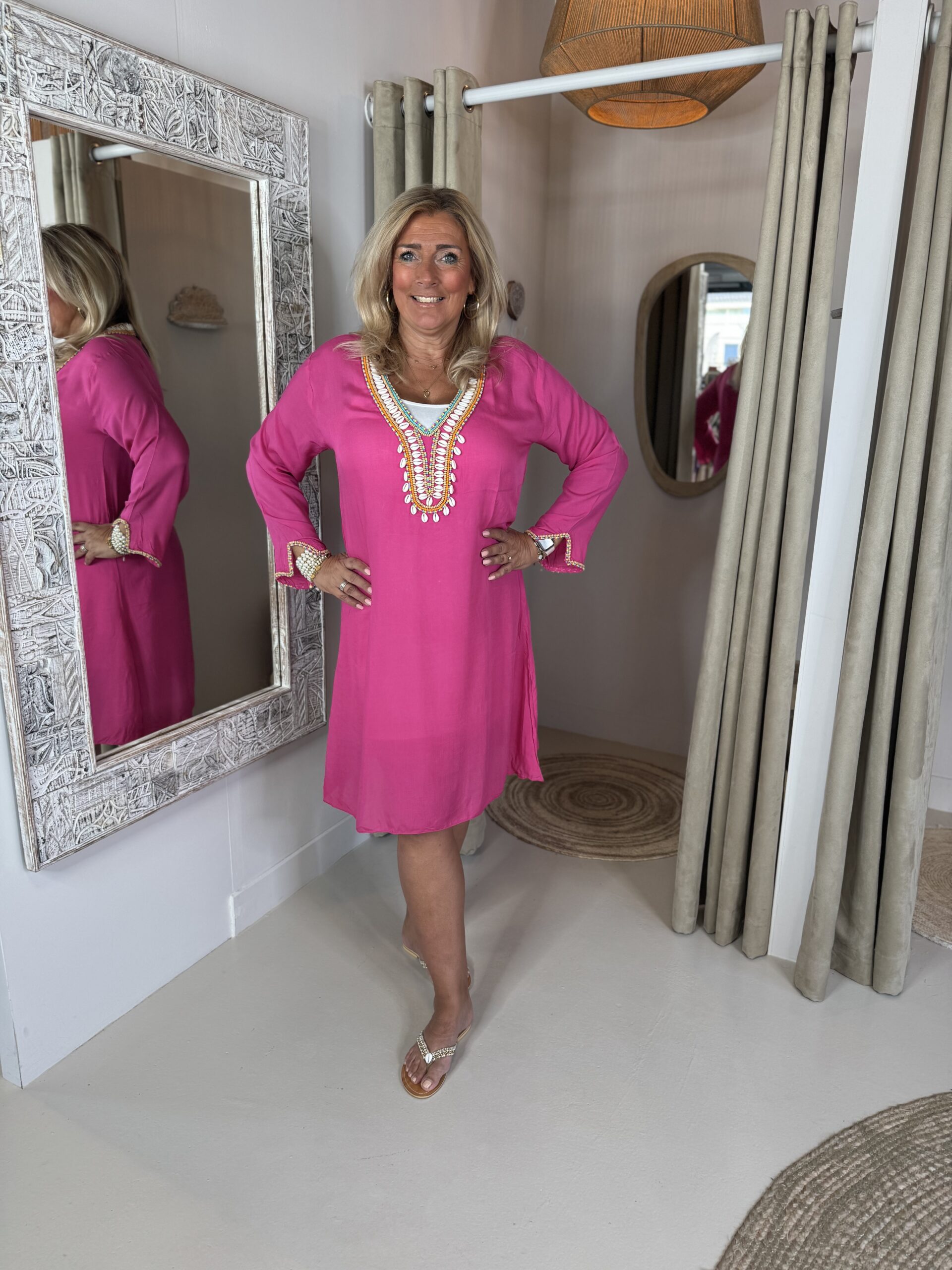 Het Hot Lava Tuniek Fortaleza Hot Pink in de mooie Rayon stof is afgewerkt met een prachtige kralen rand langs de hals en mouwen