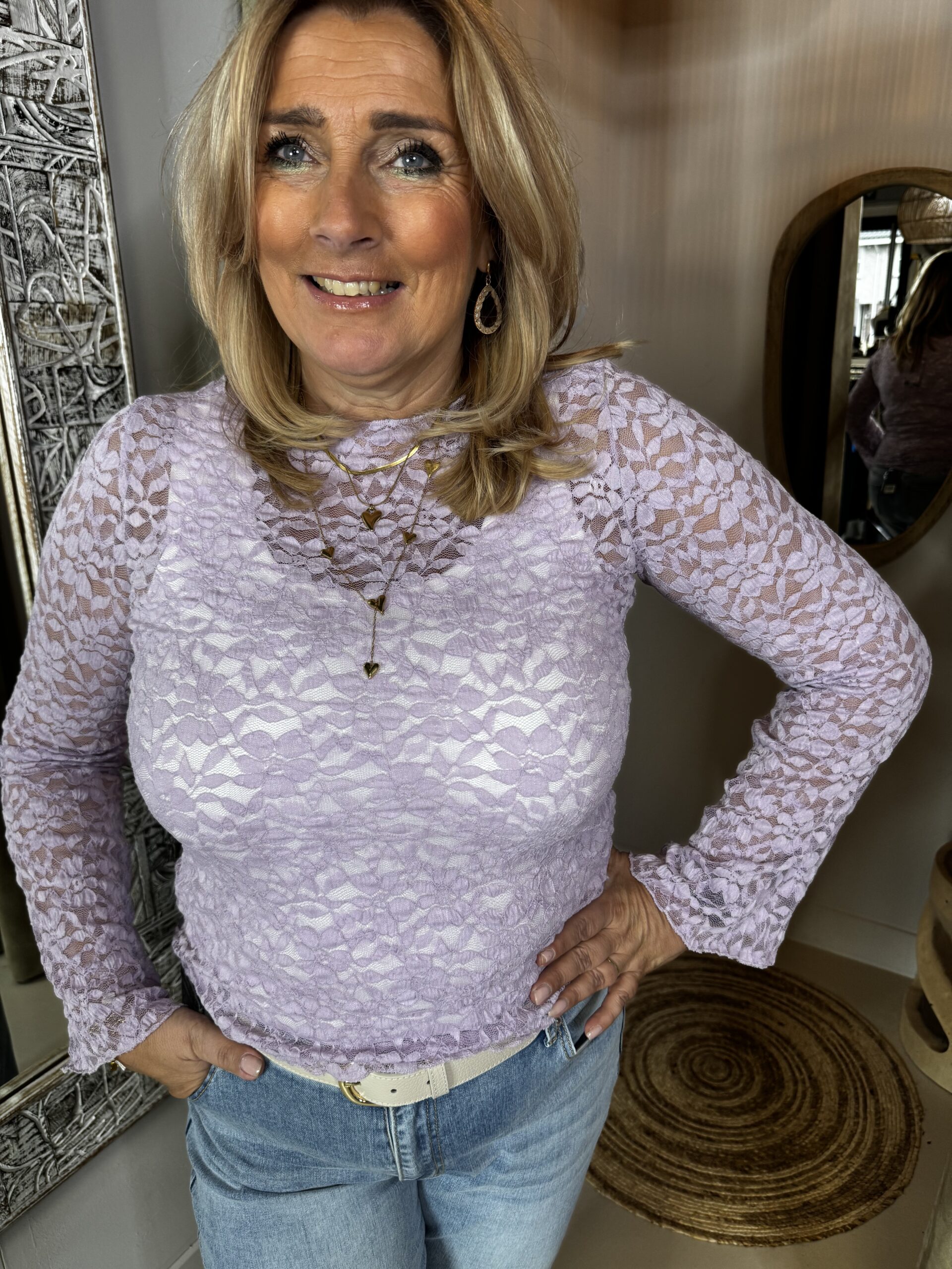 Kanten Top Bobbi Lila is een mooie kanten top met iets uitlopende manchetten