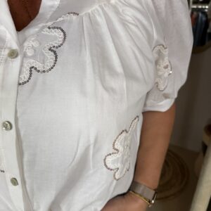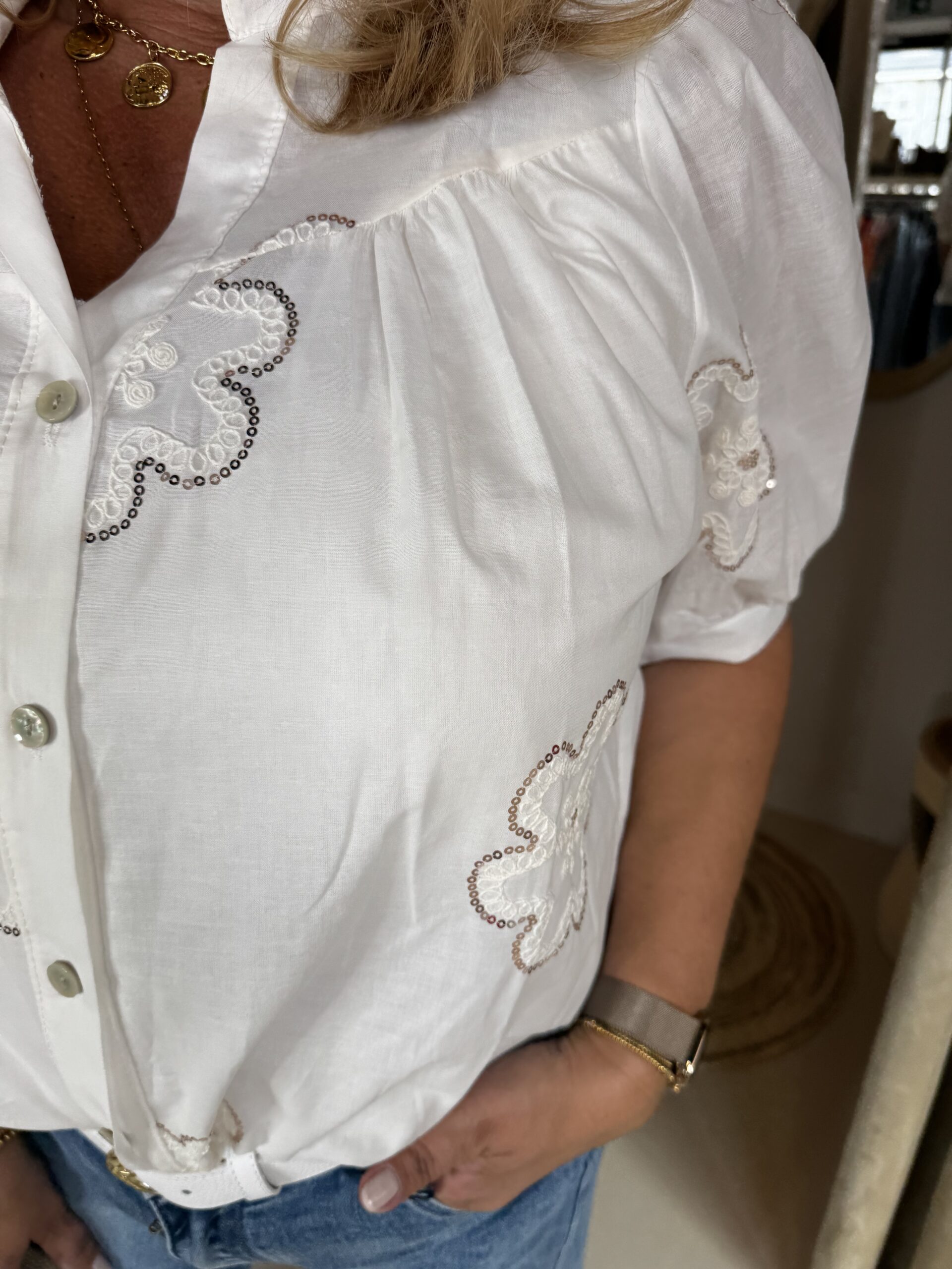 Katoenen Blouse Lynn 3019 Off-White is weer zo’n schattige katoenen blouse met leuke borduursels en pailletjes, lekker zomers