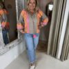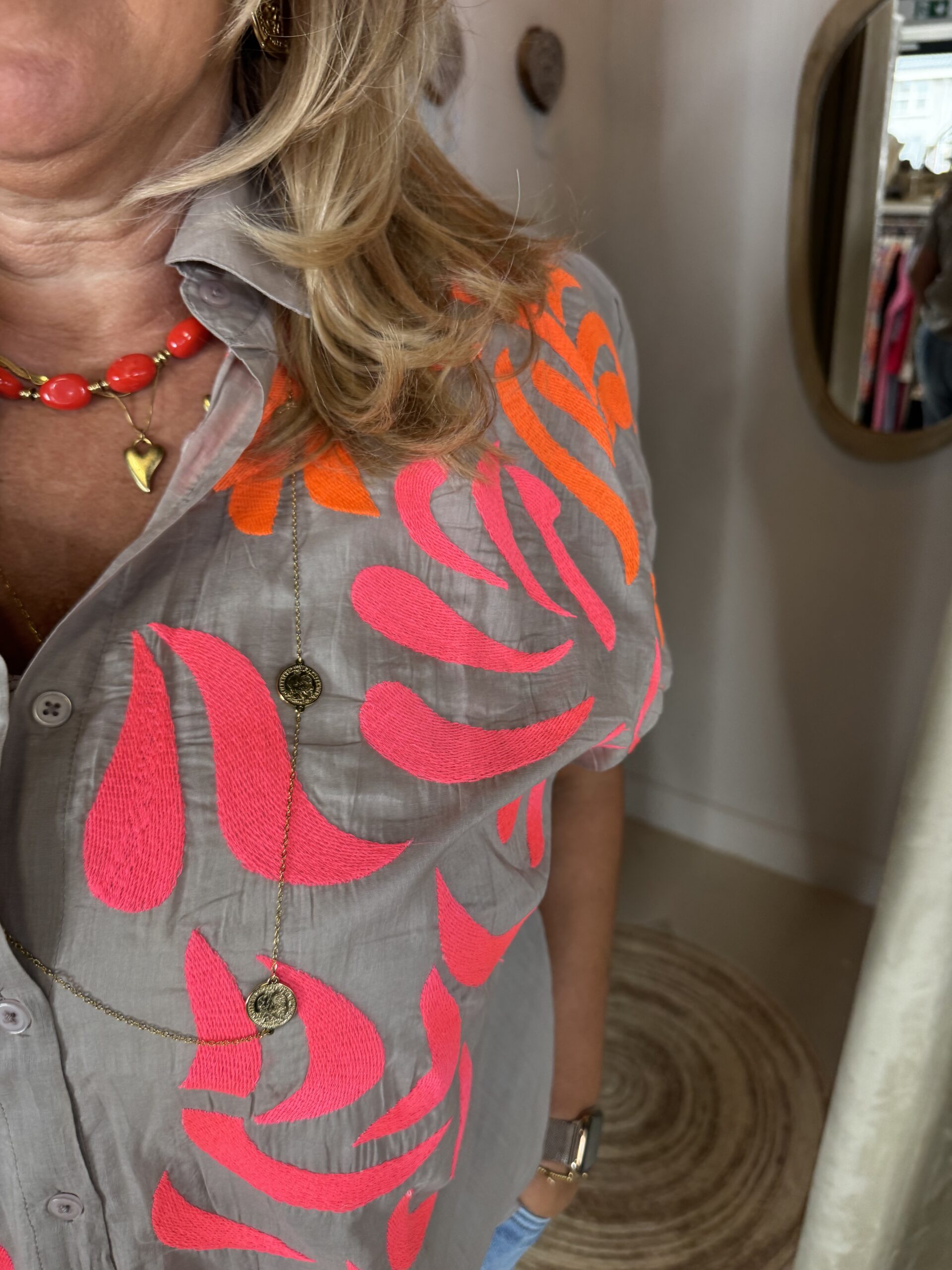 Katoenen Blouse Sierra 732 in de kleur taupe combineert het comfort van 100% katoen met de luxe uitstraling van mooie geborduurde applicaties op het voorpand