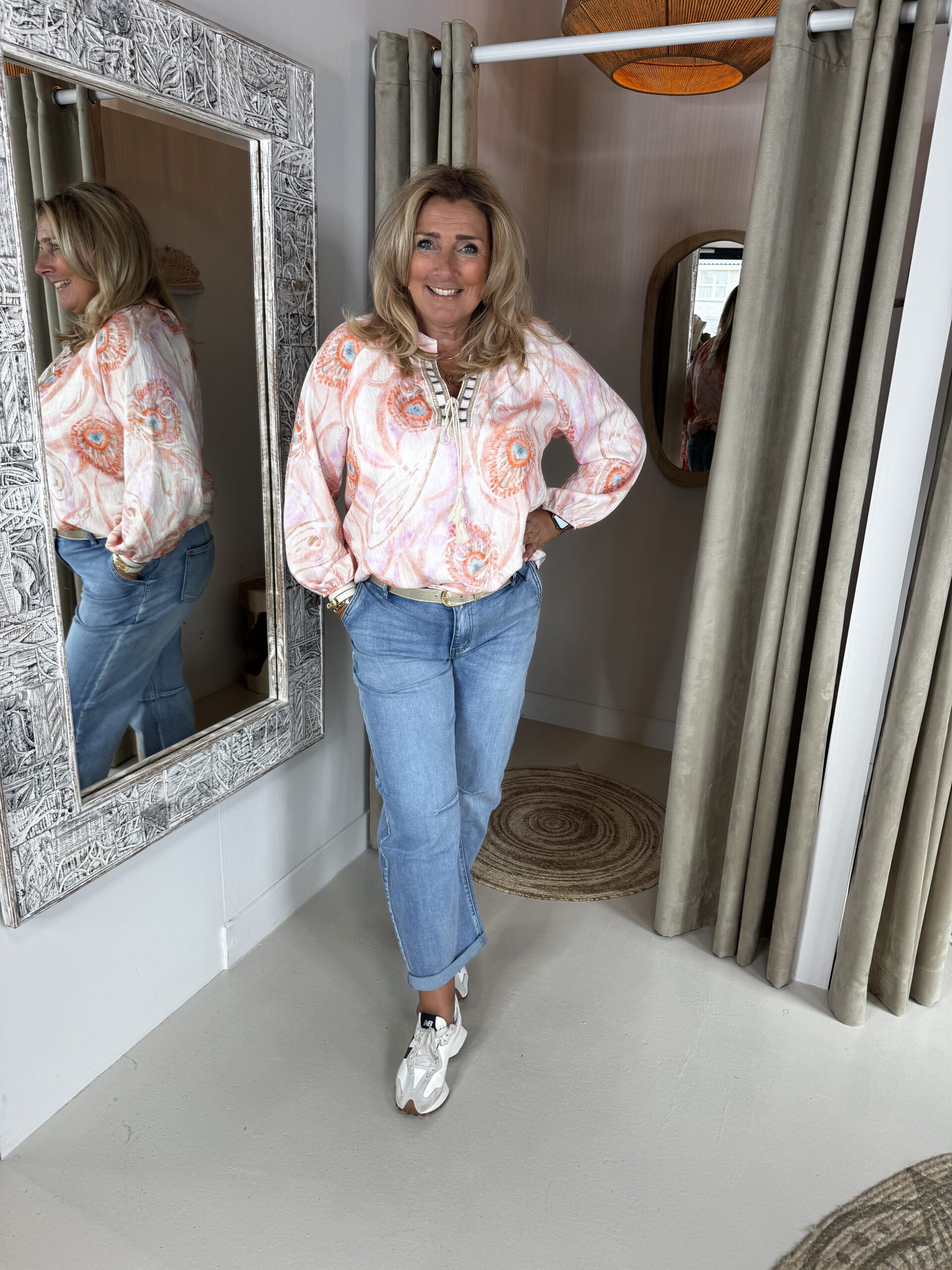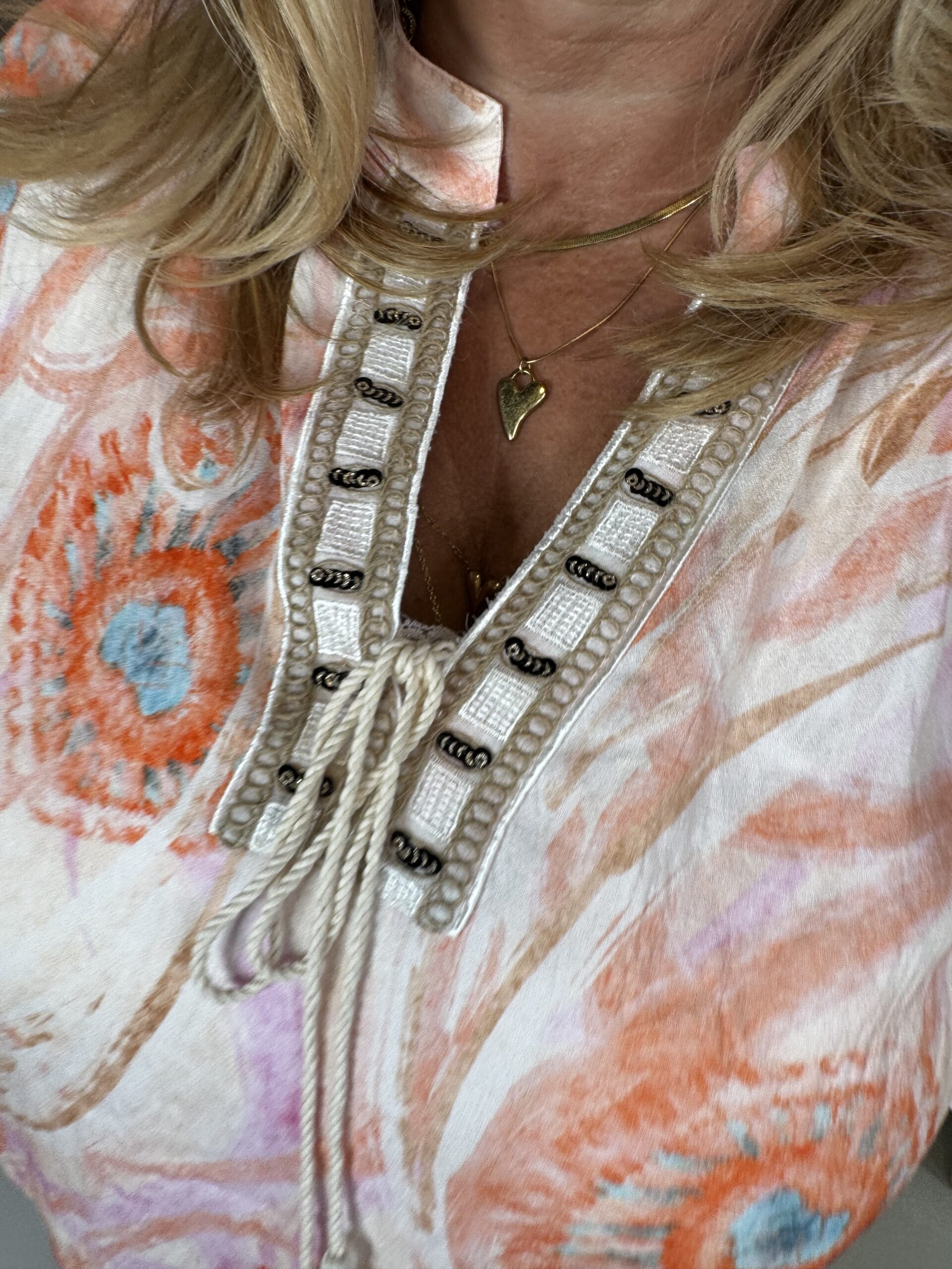 Katoenen Blouse Tarida Koraal is een leuke vrolijke blouse in een bekend model. Een makkelijke pasvorm, met een leuke band langs de v-hals