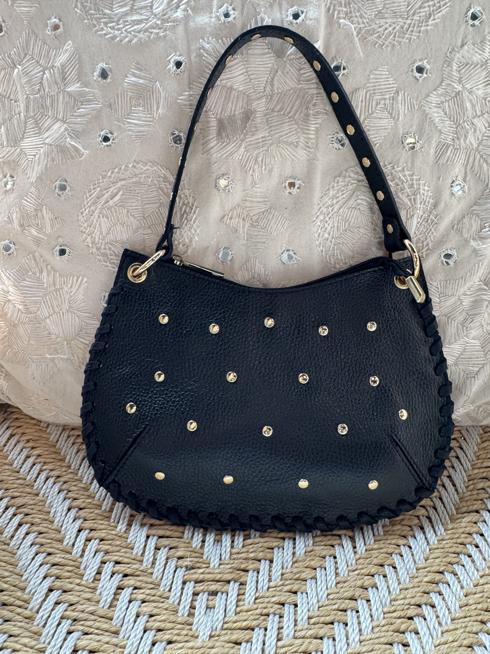Deze super leuke tas heeft studs verdeeld over het voorpand en een leuke sierlijke rand.