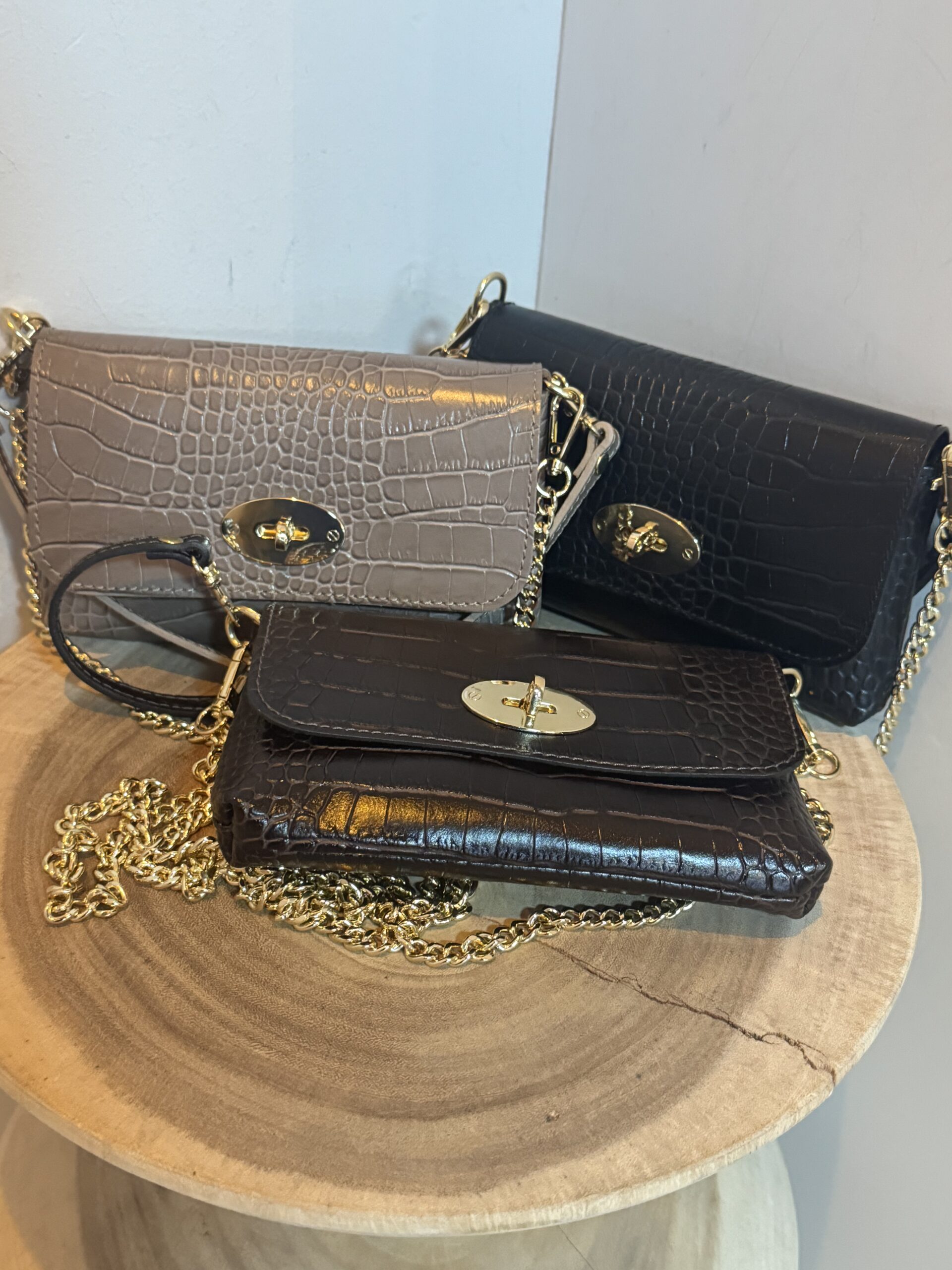 Dit leren envelop Leren Tas Finley Croco Zwart is te dragen als clutch, maar ook als cross body tas.