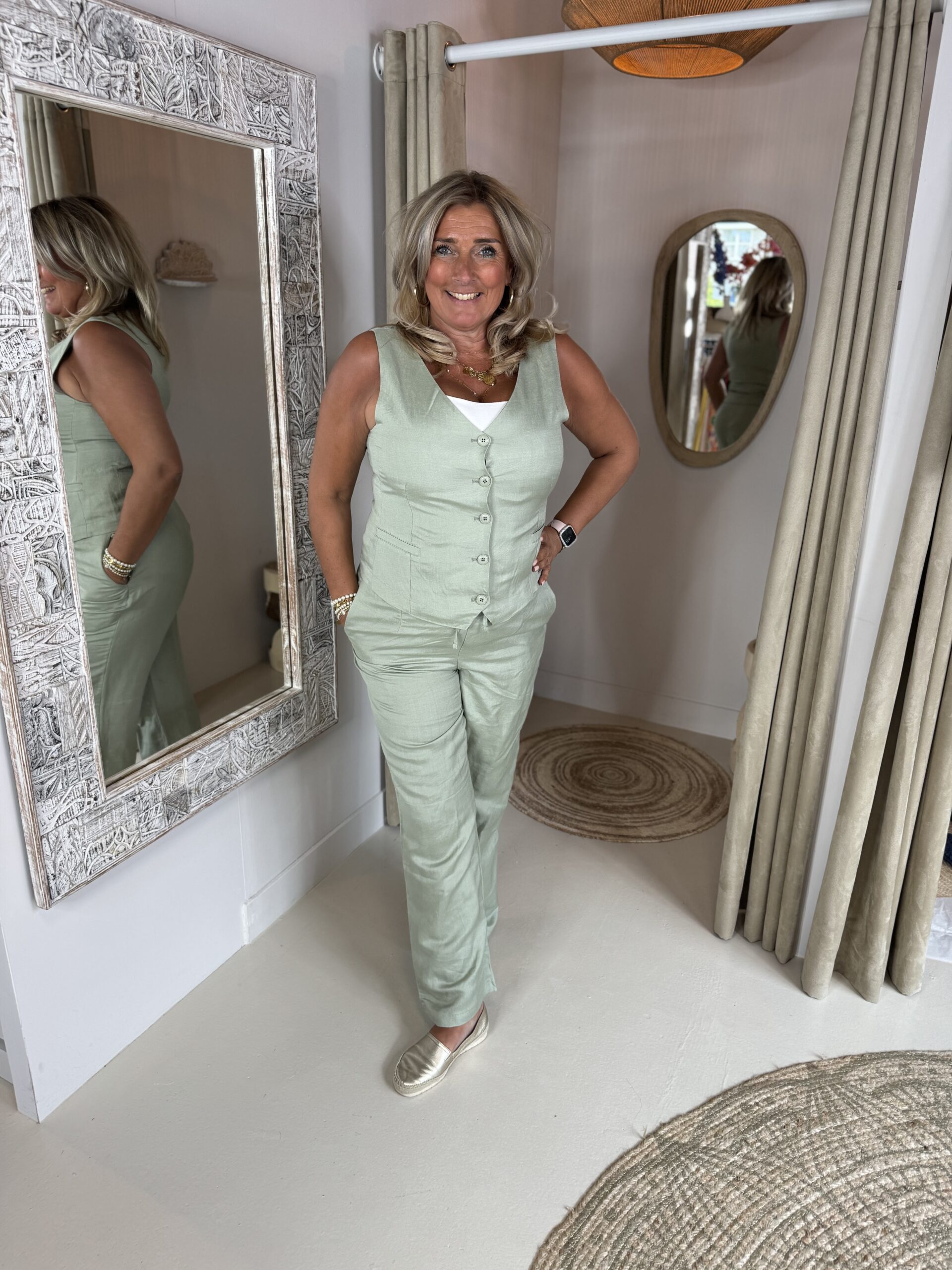 Het gilet heeft een knoopsluiting en staat heel stijlvol met de bijpassende linnen broek van dit merk in dezelfde kleur
