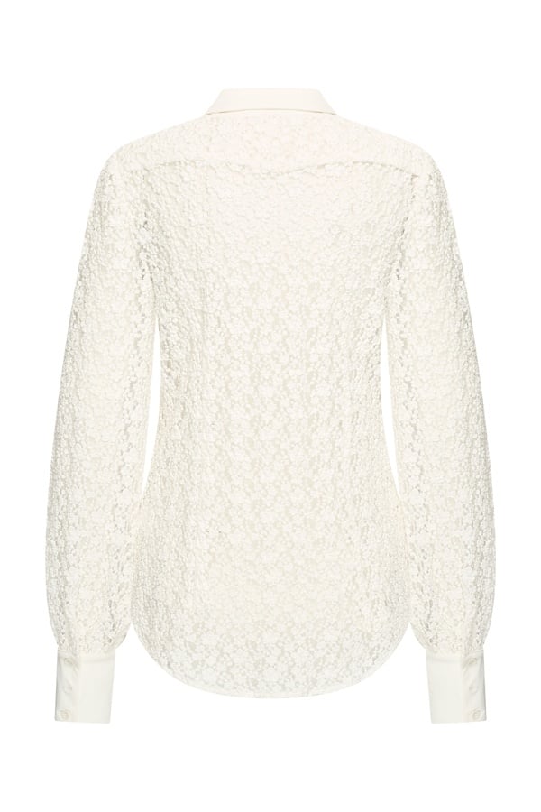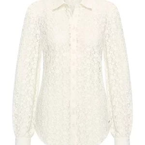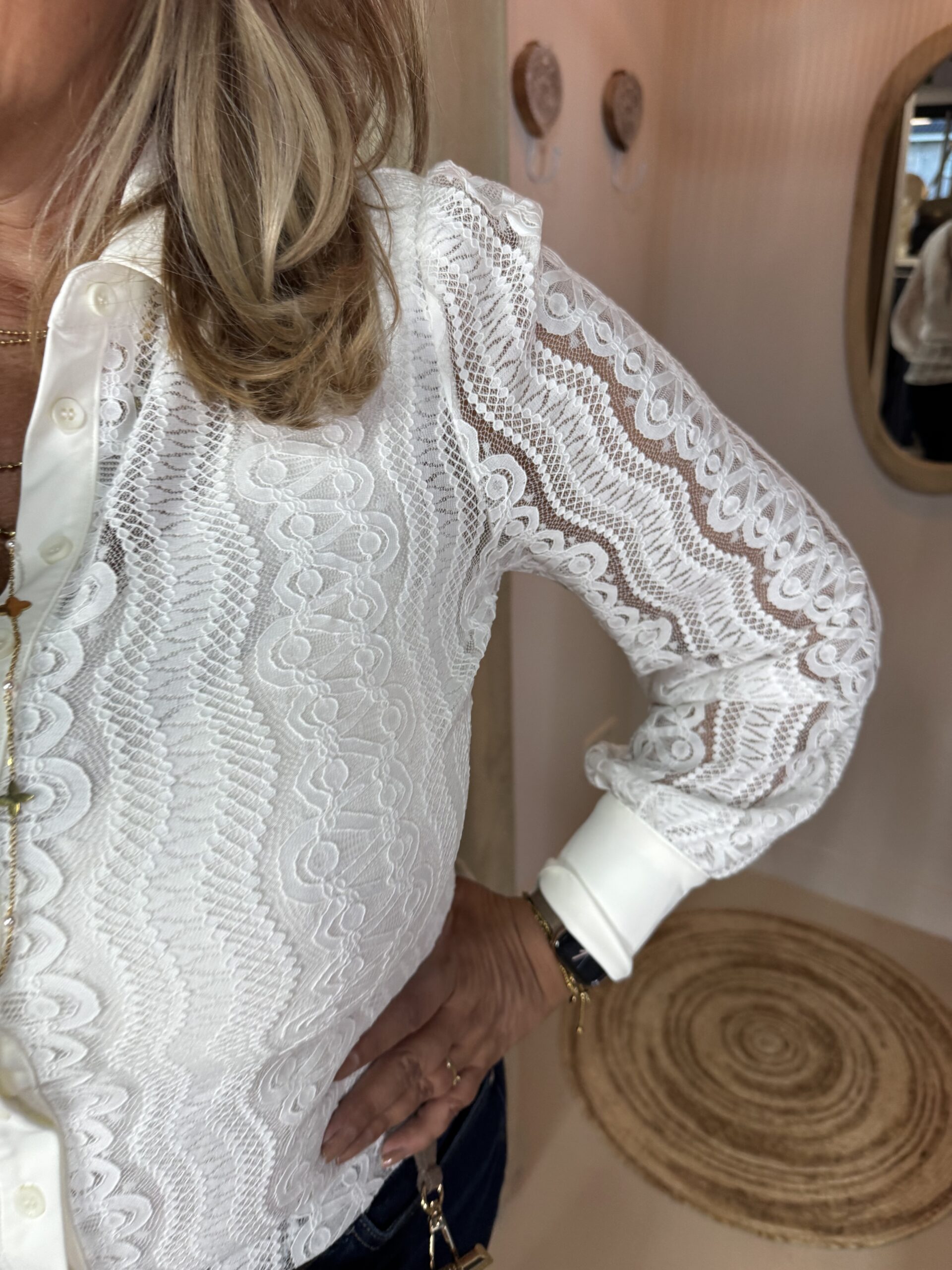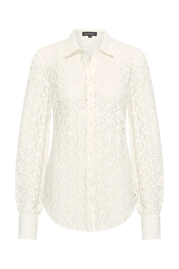 Dit mooie Mi Piace Travelstof Blouse 202352 Kant Off-White van het merk Mi Piace is gemaakt van heel mooi kant en travelstof manchetten en kraag