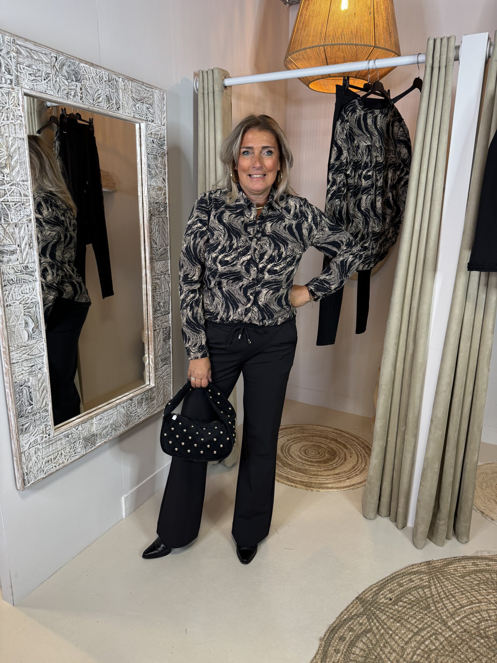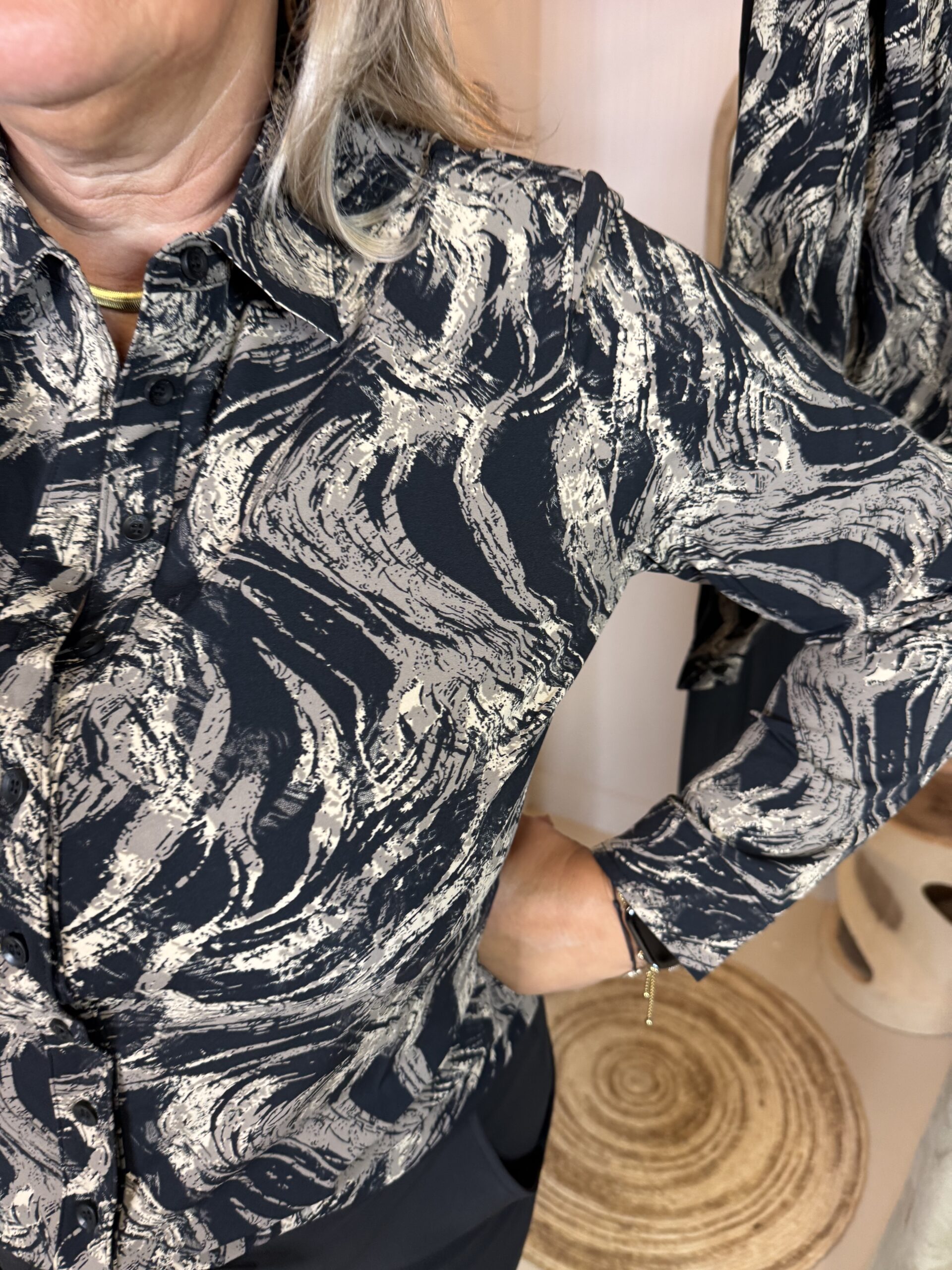 Mi Piace Travelstof Blouse 60840 Swirley Print Zwart|Taupe