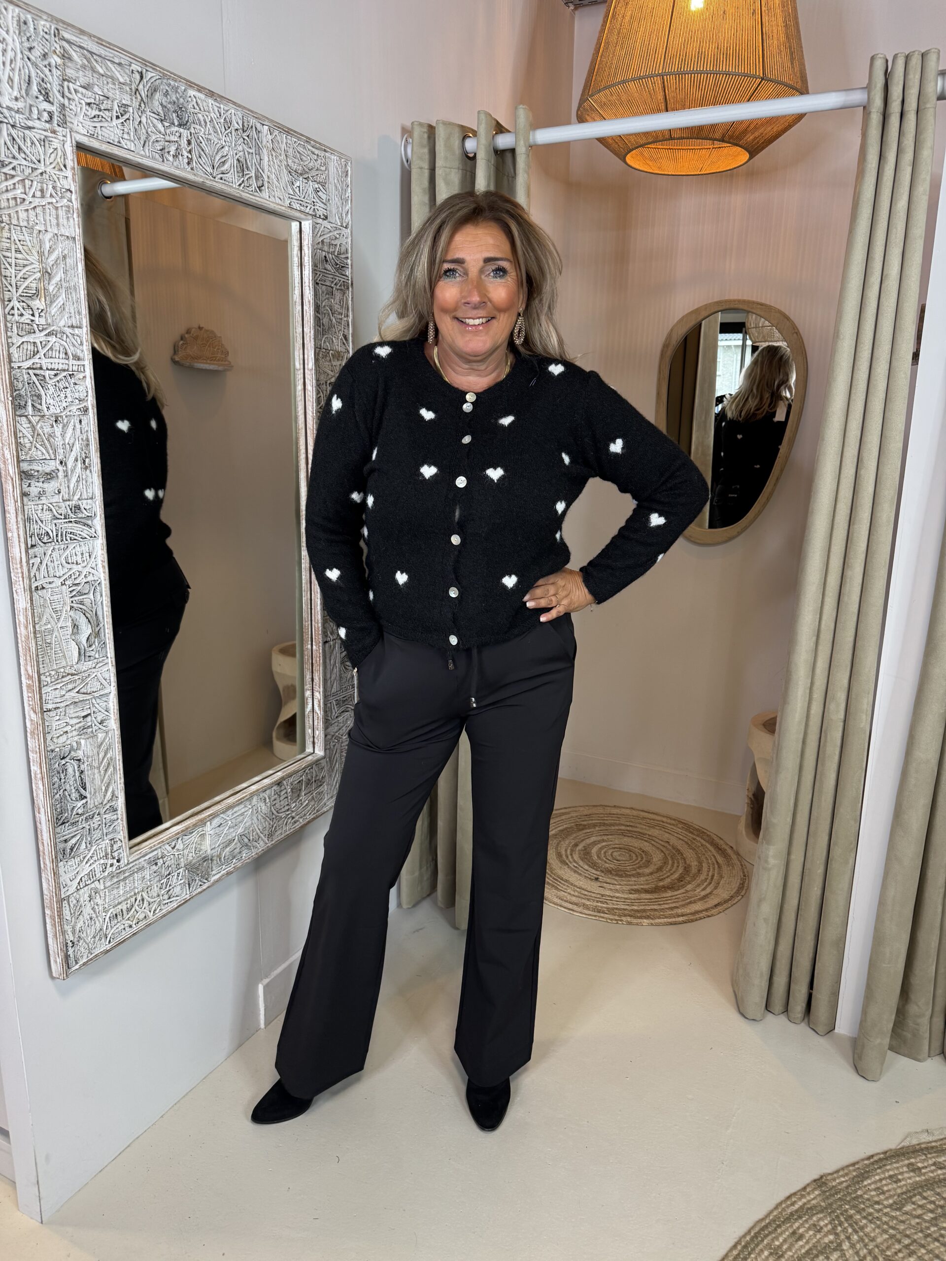 Monique is 174 en draagt confectie maat 42-44 en heeft van deze broek de XL aan