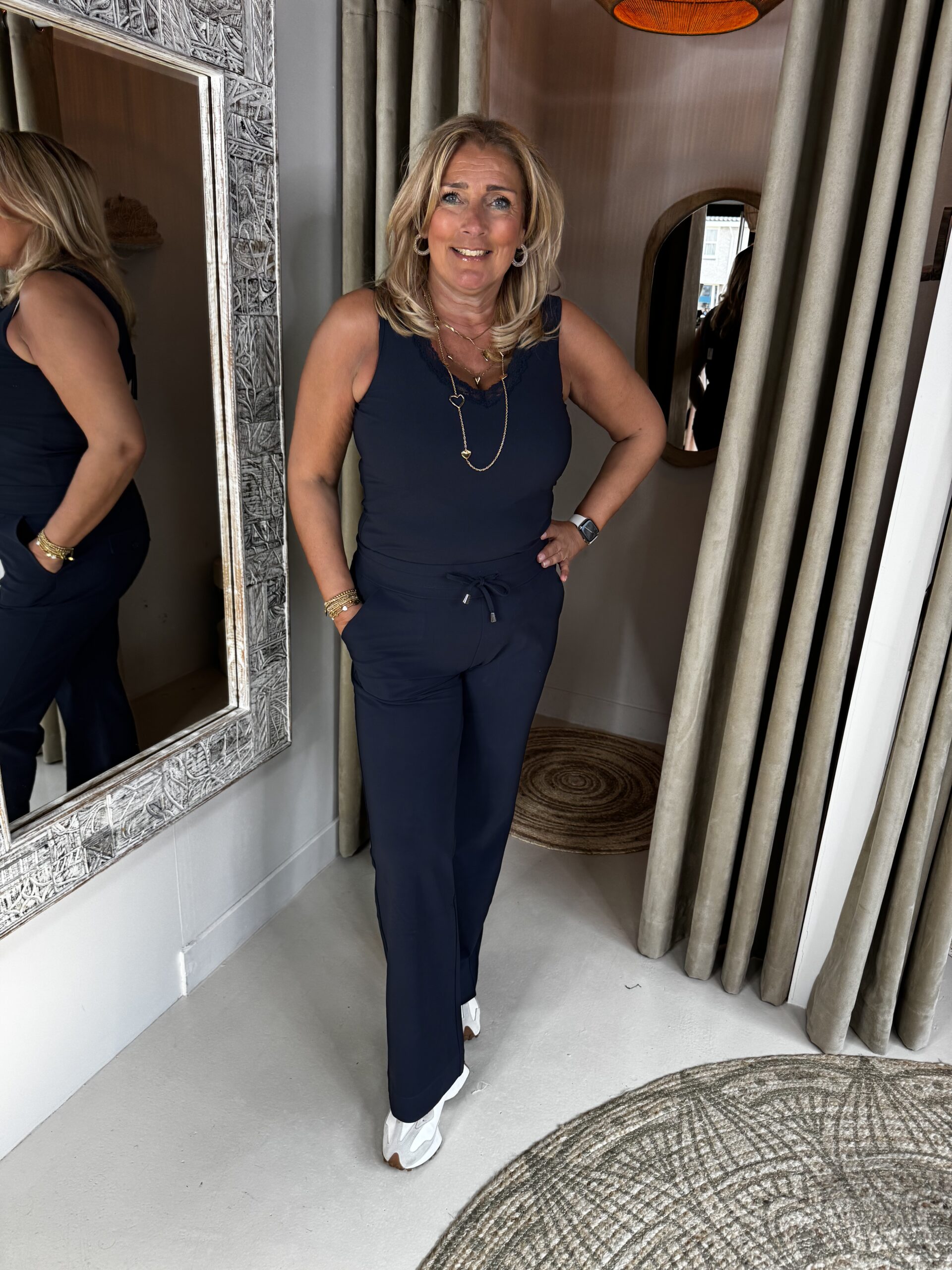 Monique draagt maat 42/44, heeft van deze top de XL aan en is 174.