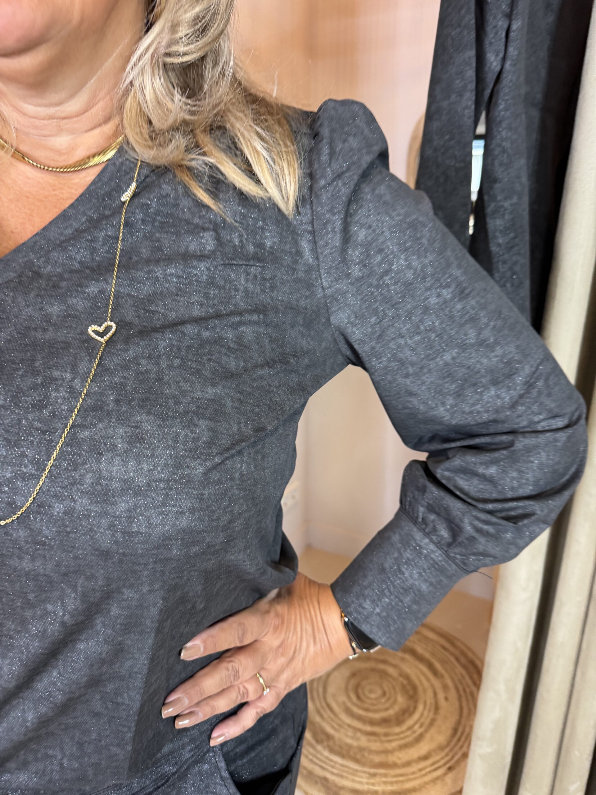 De top heeft een v-hals, mooie pofballon mouwen en de iets langere manchetten sluiten met 3 knoopjes