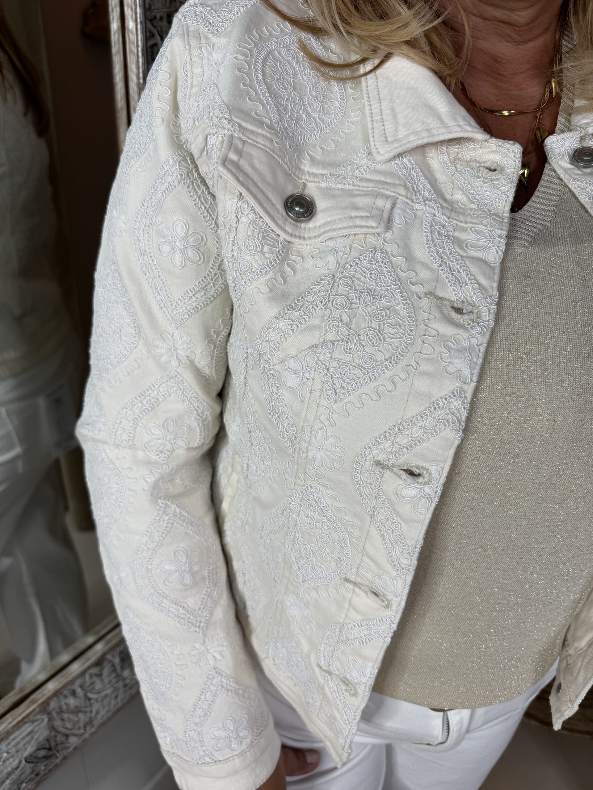 Dit mooie getailleerde spijkerjasje in off-white is over het hele jasje voorzien van hele mooie Stiksels, waardoor het jasje een mooie luxe uitstraling heeft