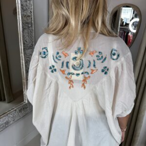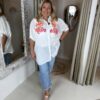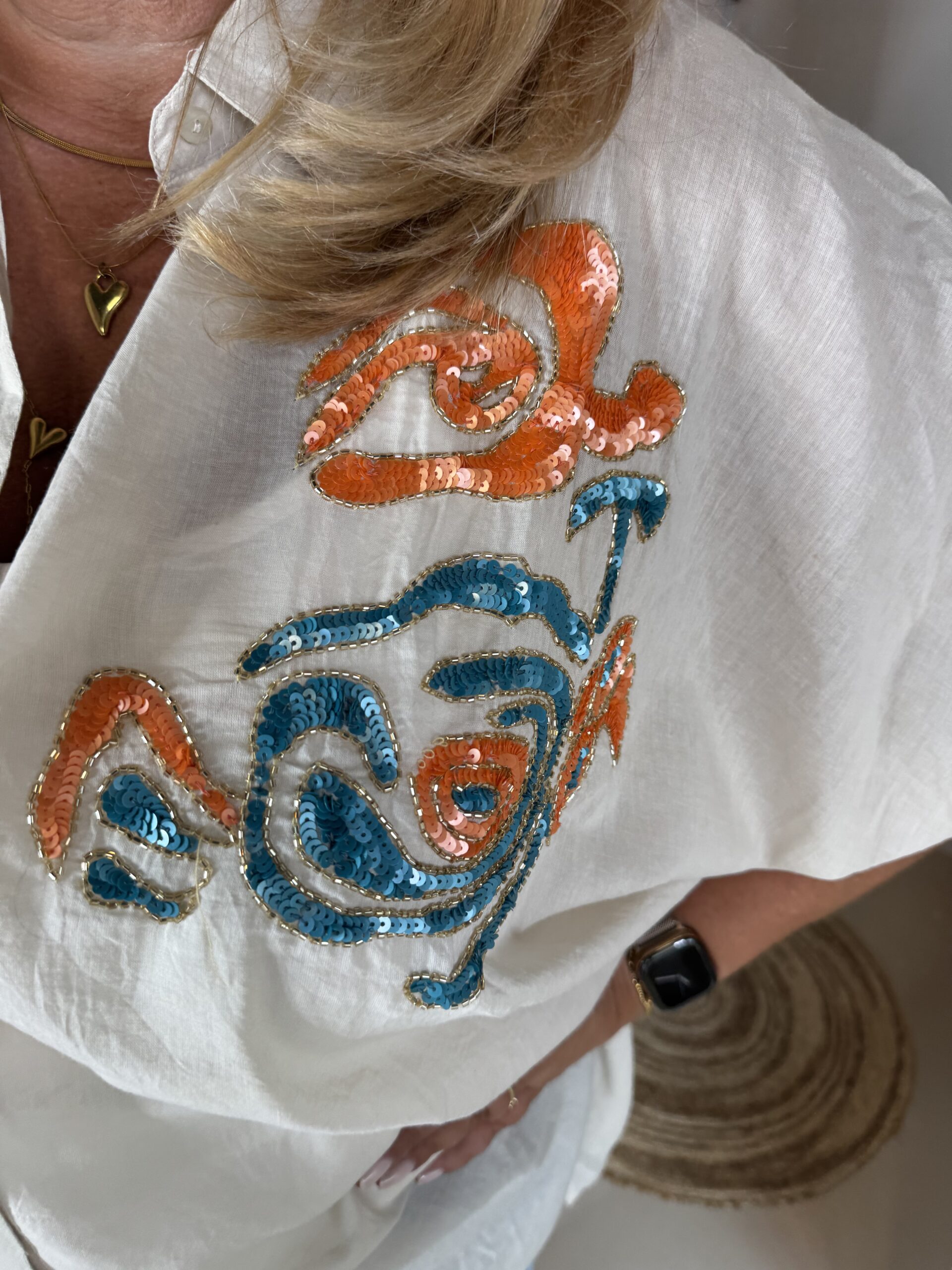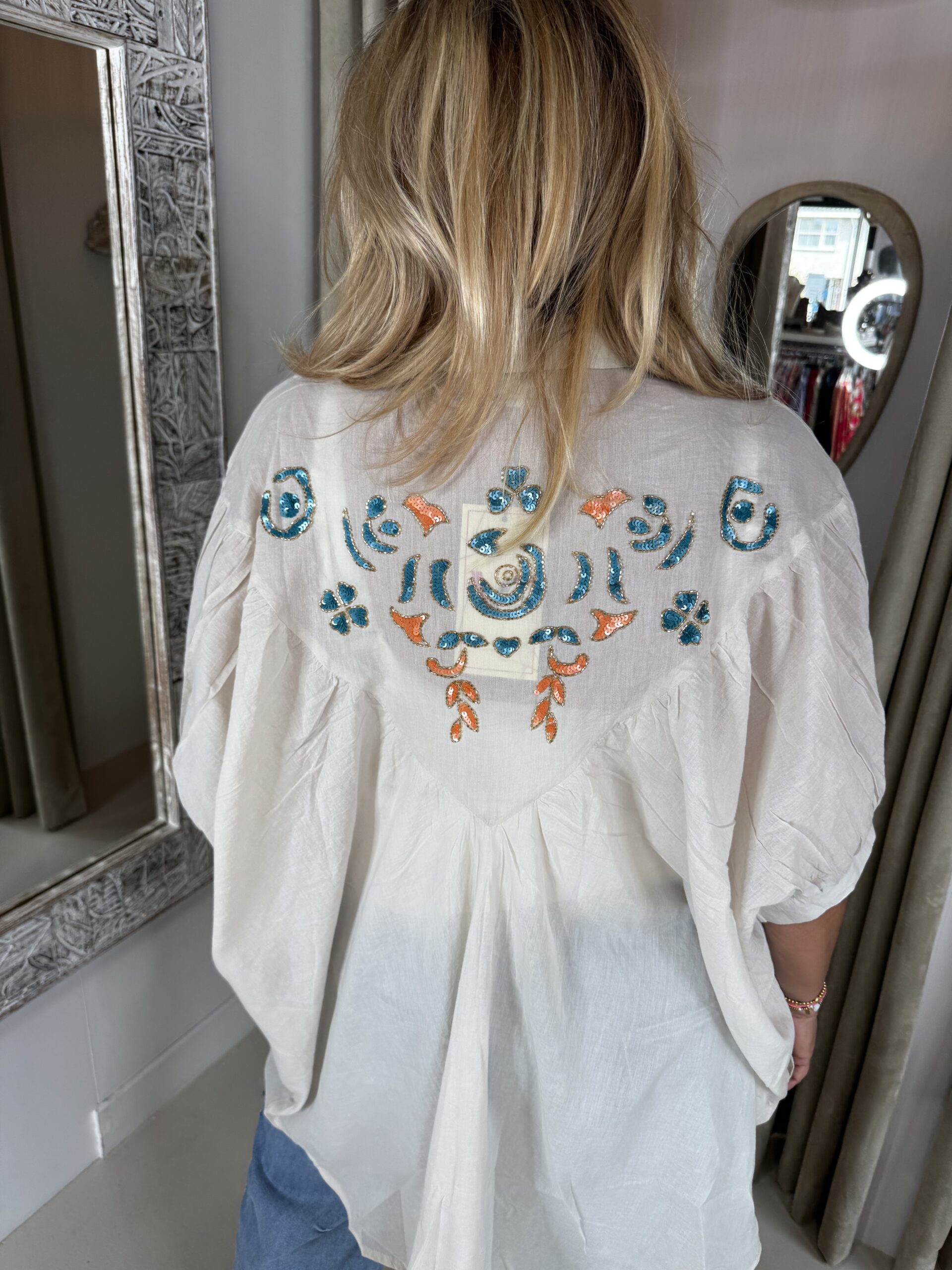 Oversized Katoenen Blouse Carmen 2642 in de kleur zand combineert het comfort van 100% katoen met de luxe uitstraling van prachtige pailletten-applicaties.