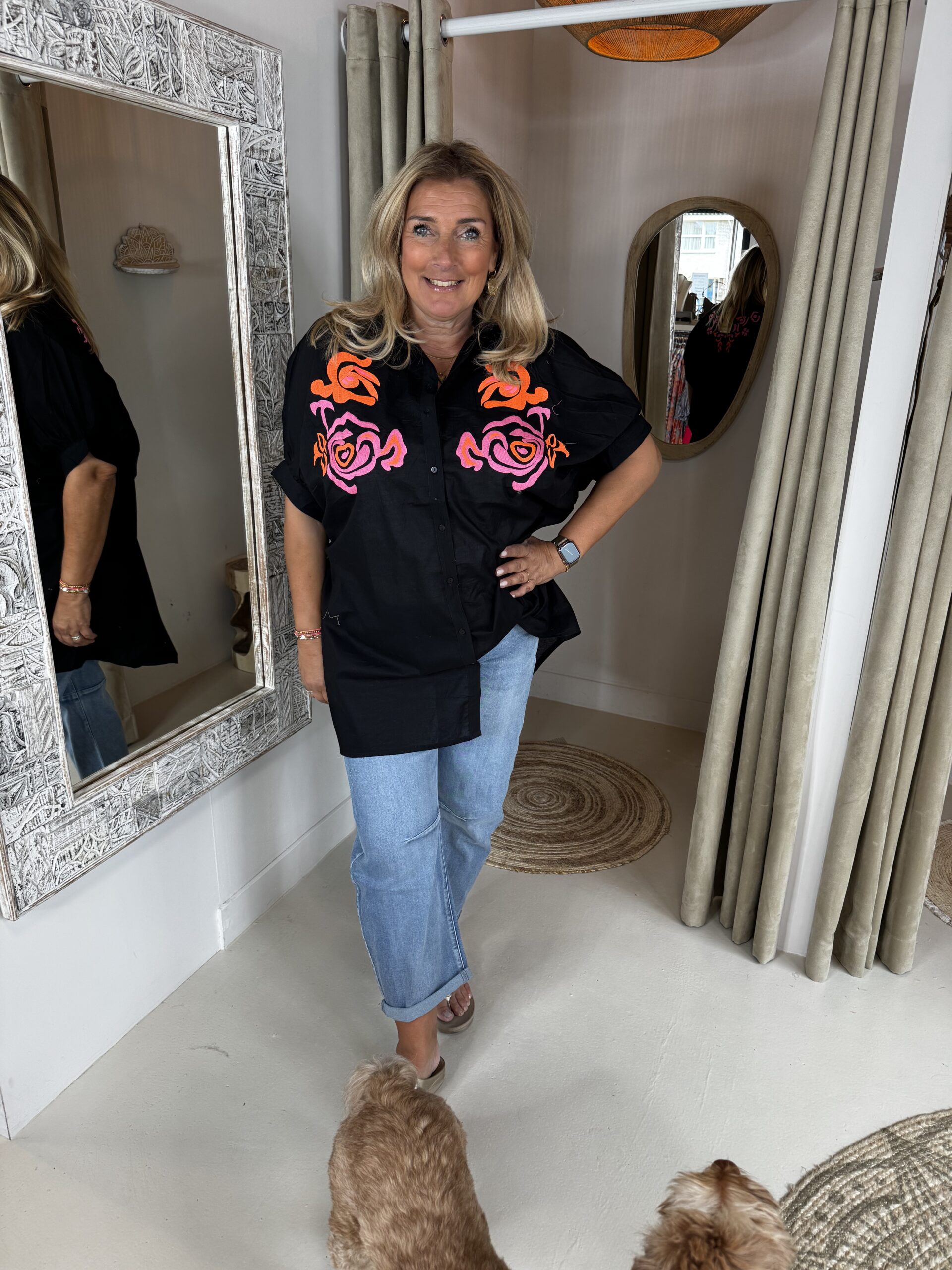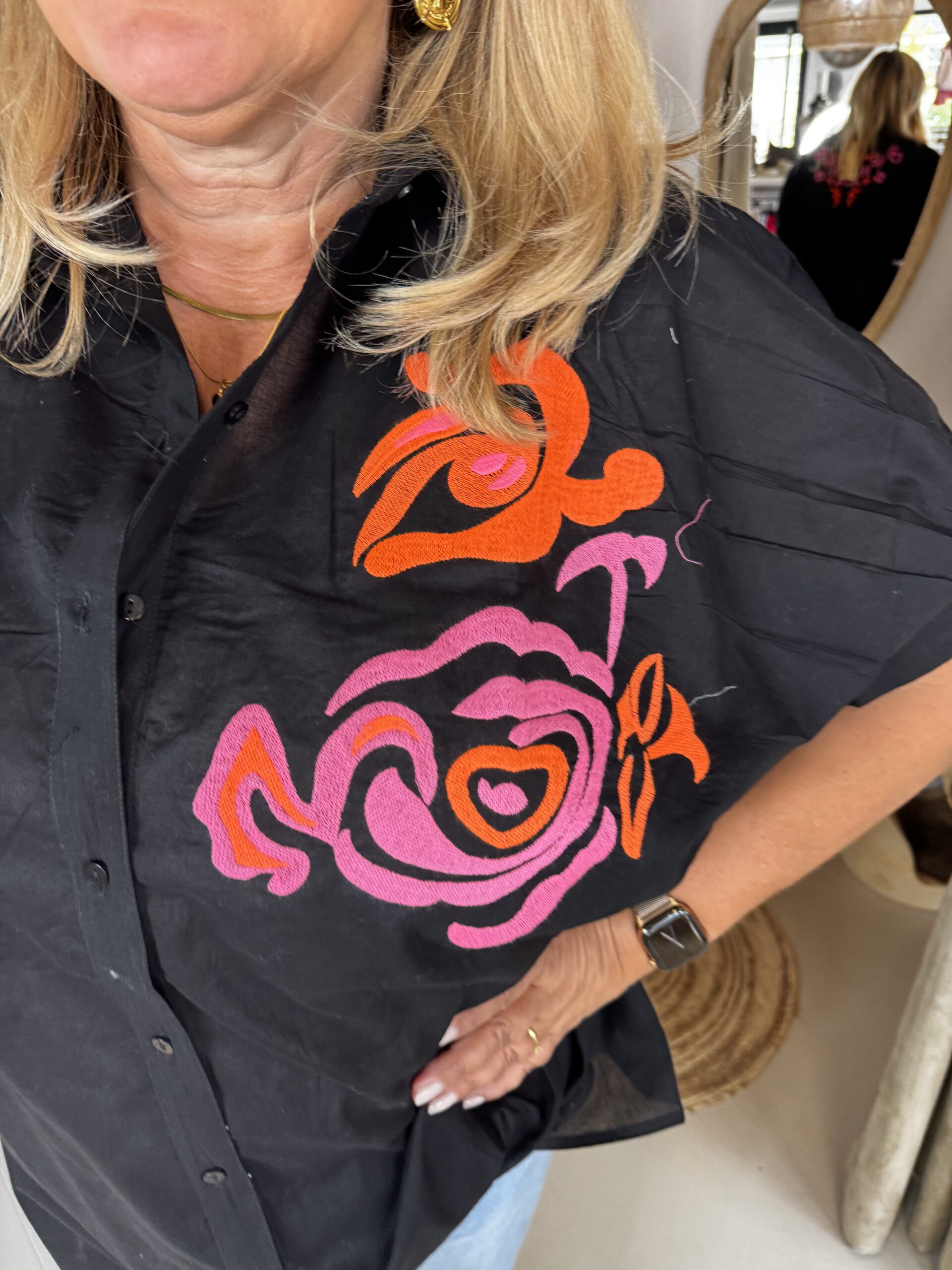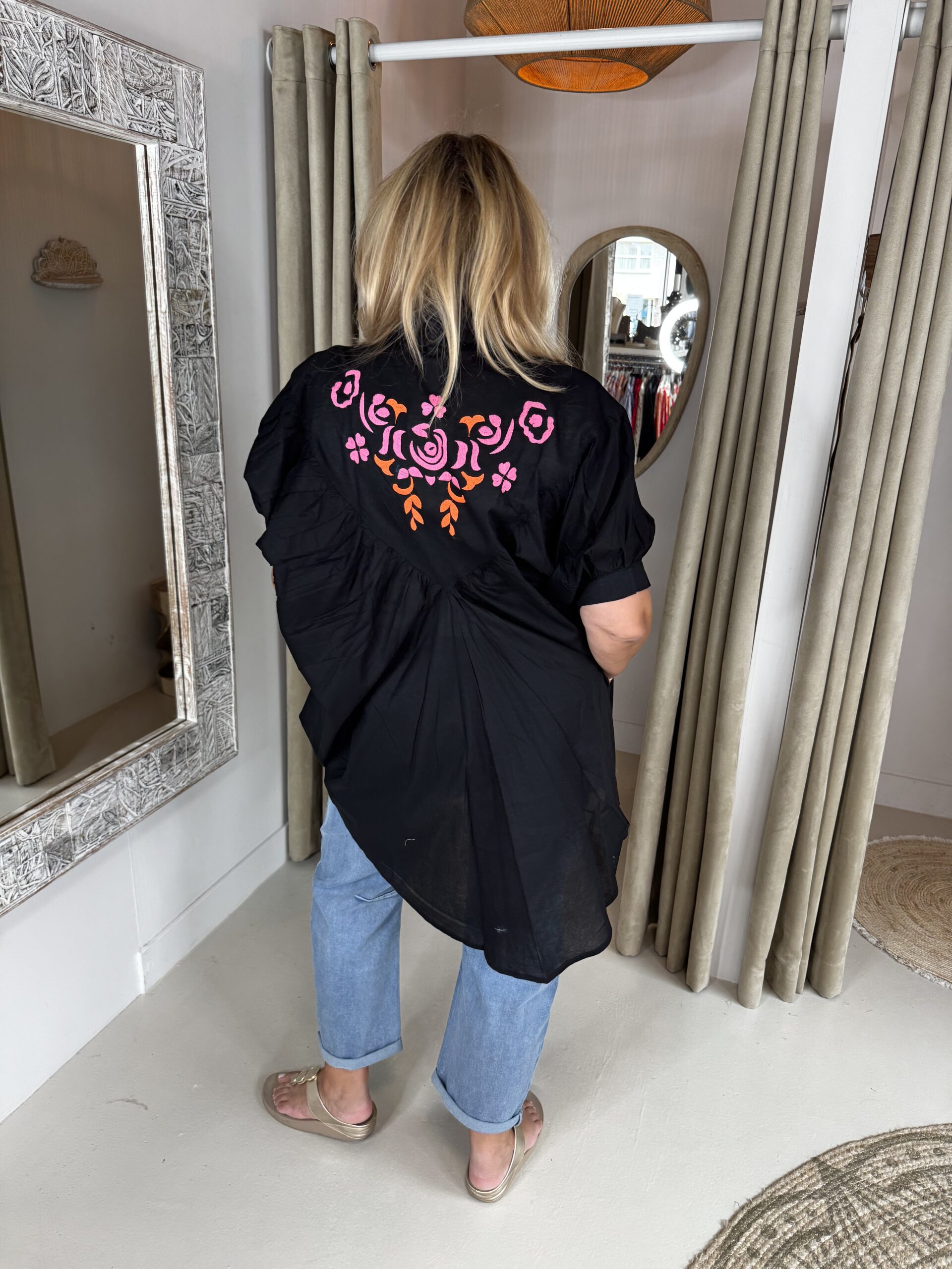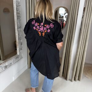 Oversized Katoenen Blouse Teresa 2648 Zwart in de kleur zwart combineert het comfort van 100% katoen met de luxe uitstraling van moie geborduurde applicaties.