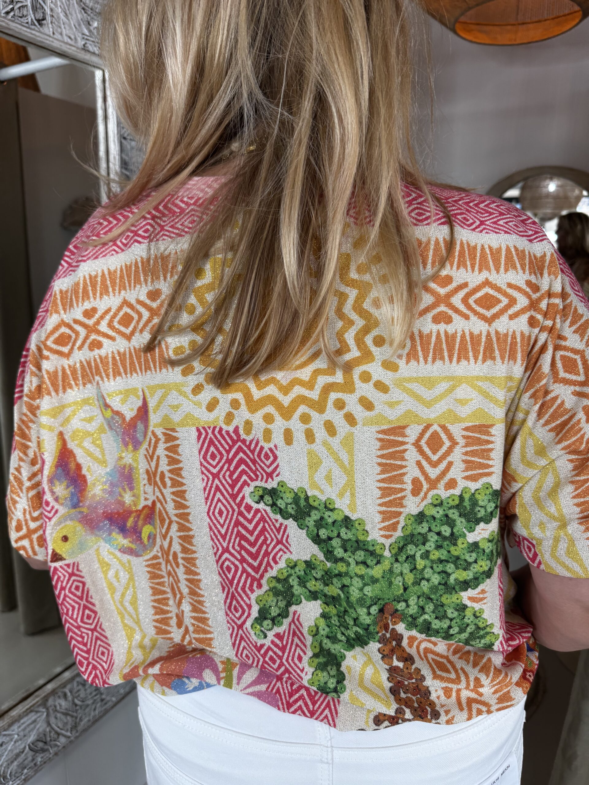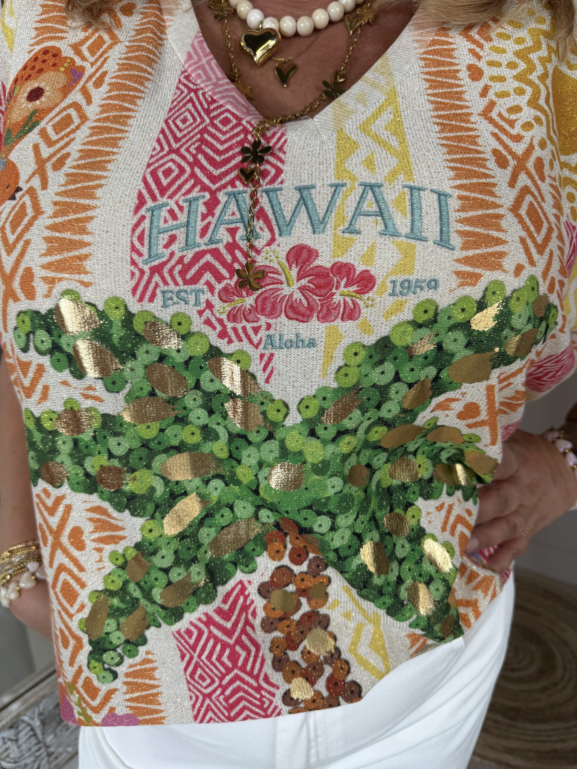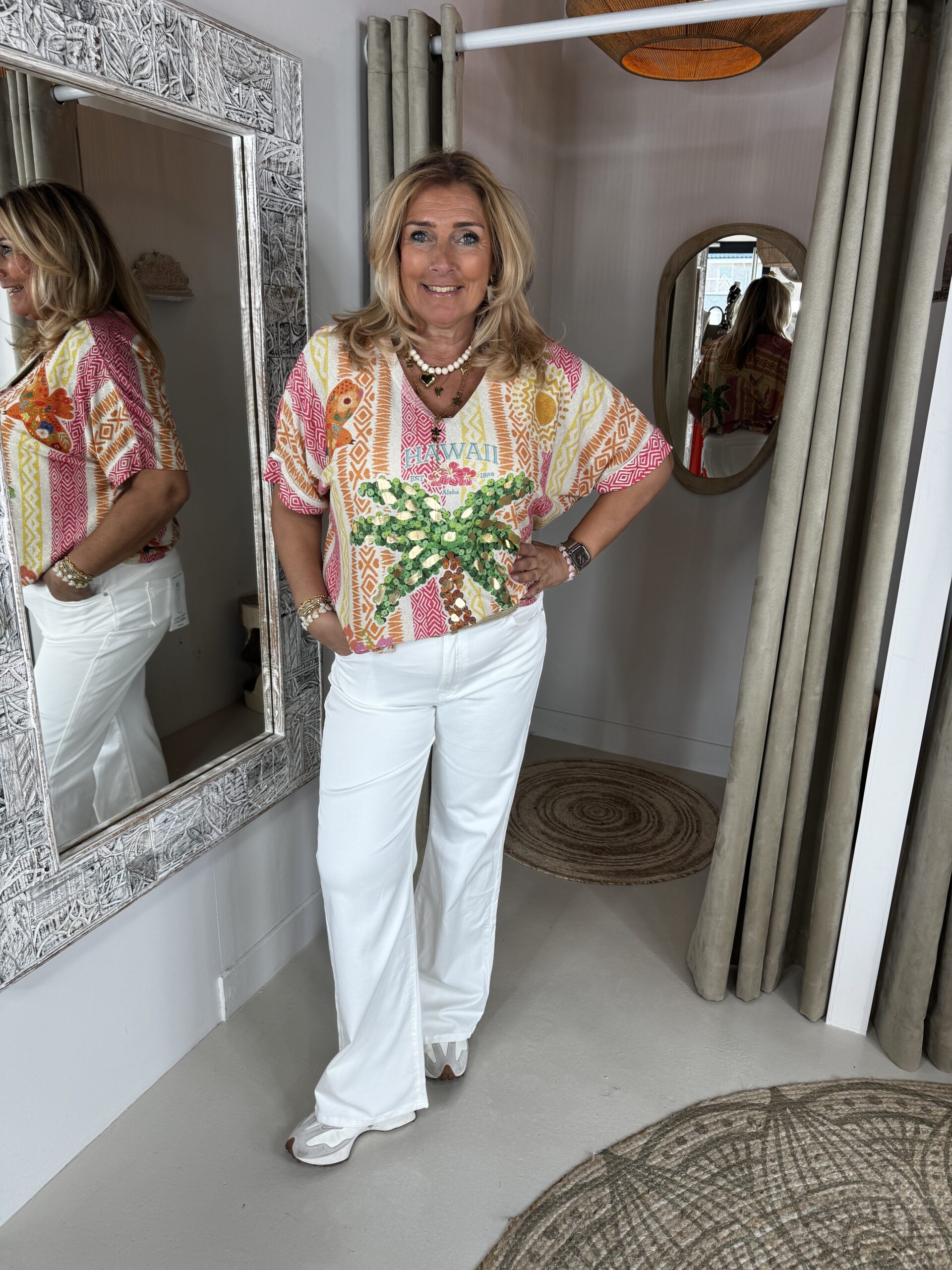Oversized Top Sunny 2967 Hawaii is een losvallende t-shirt met een lurex draadje door de stof waardoor hij heerlijk “shined”