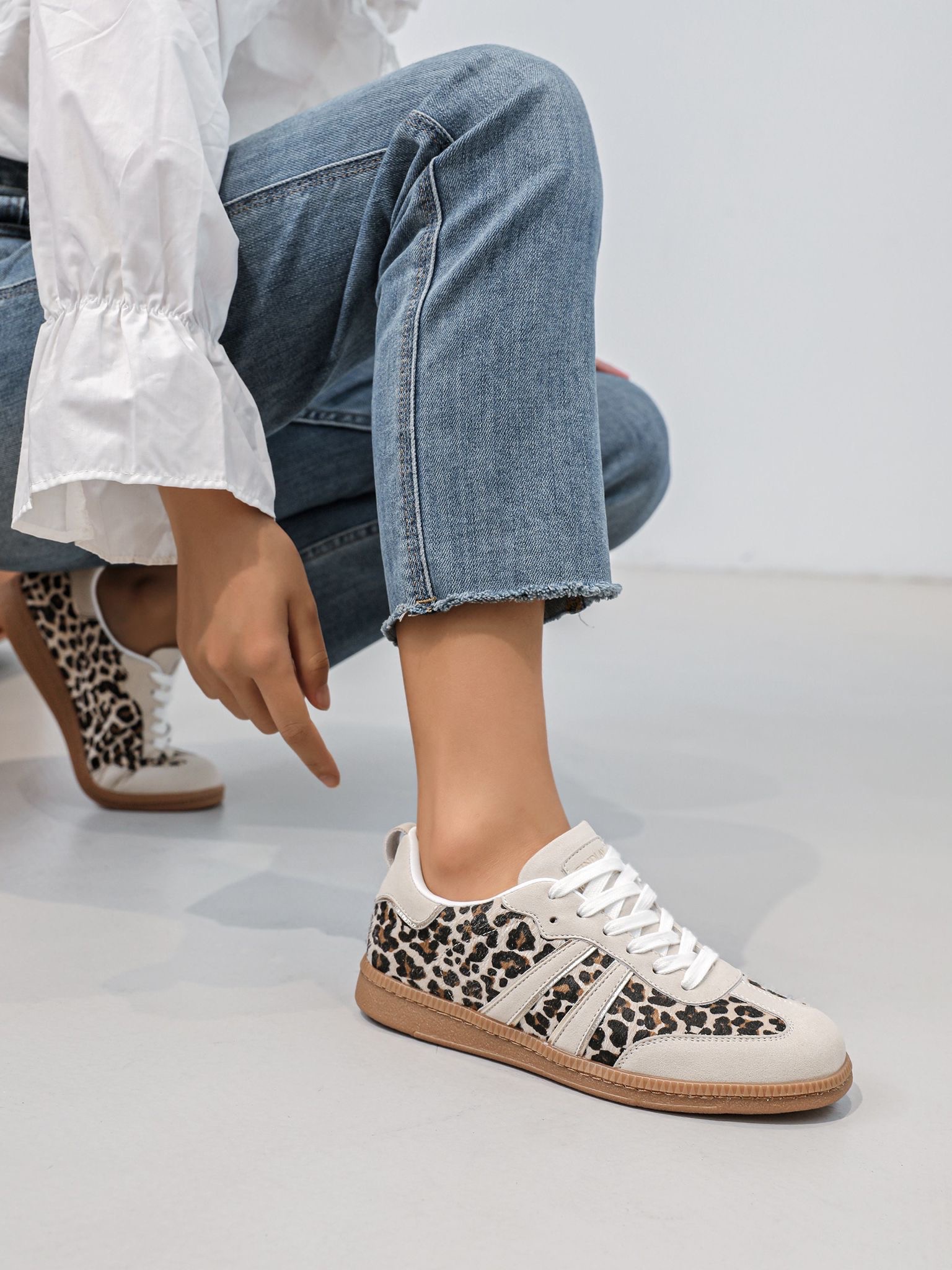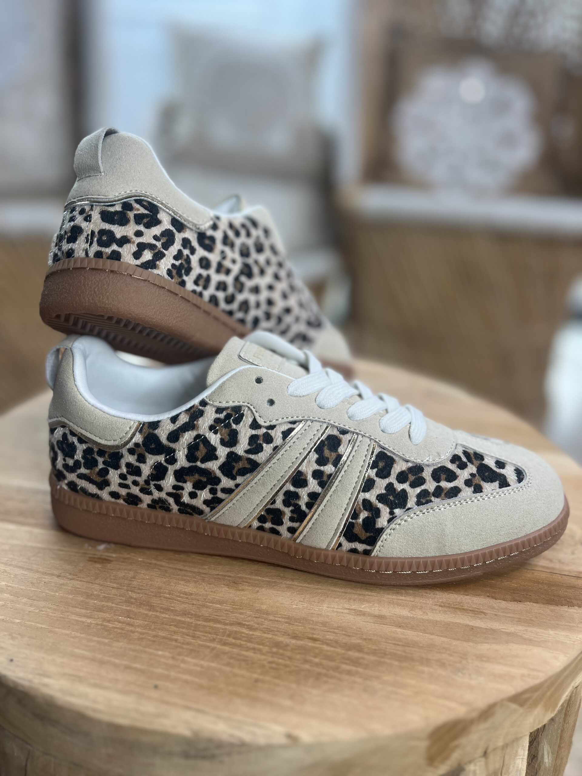 De combinatie van de suedine leopard print met beige en subtiele gouden details maken deze sneakers zowel vrouwelijk als stoer