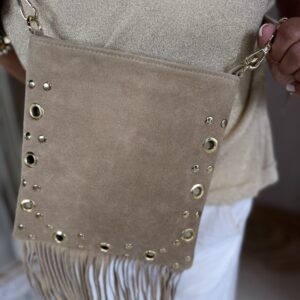 De Indigo crossbody tas is gemaakt van hoogwaardig 100% suède leer en afgewerkt met goudkleurige hardware en speelse franjes. Het hoofdvak sluit met een rits en bevat een binnenvakje met ritssluiting voor kleine essentials. Dankzij de verstelbare schouderriem draag je de tas comfortabel crossbody.