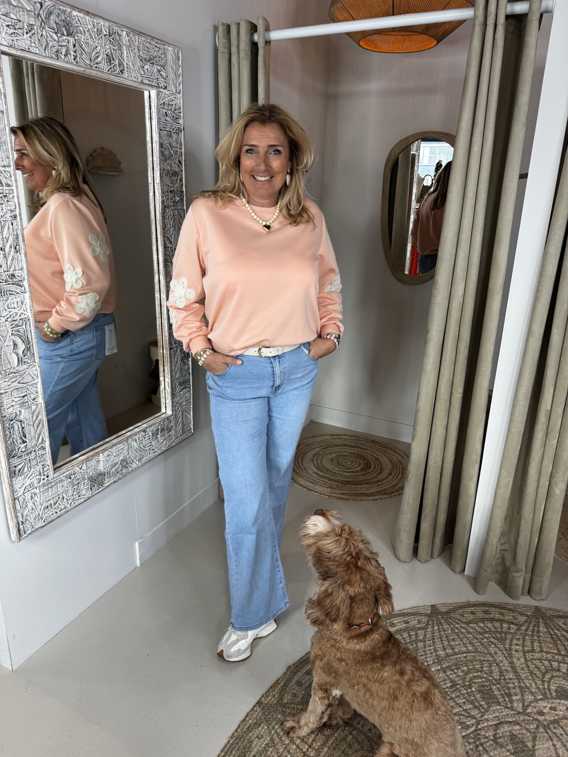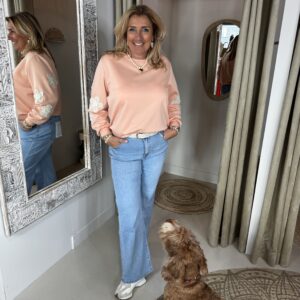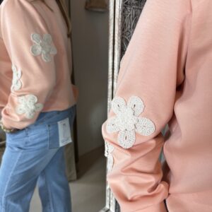 Sweater 70511 Peach Bloem op Mouw is een heerlijke zachte sweater die je zo aanschiet