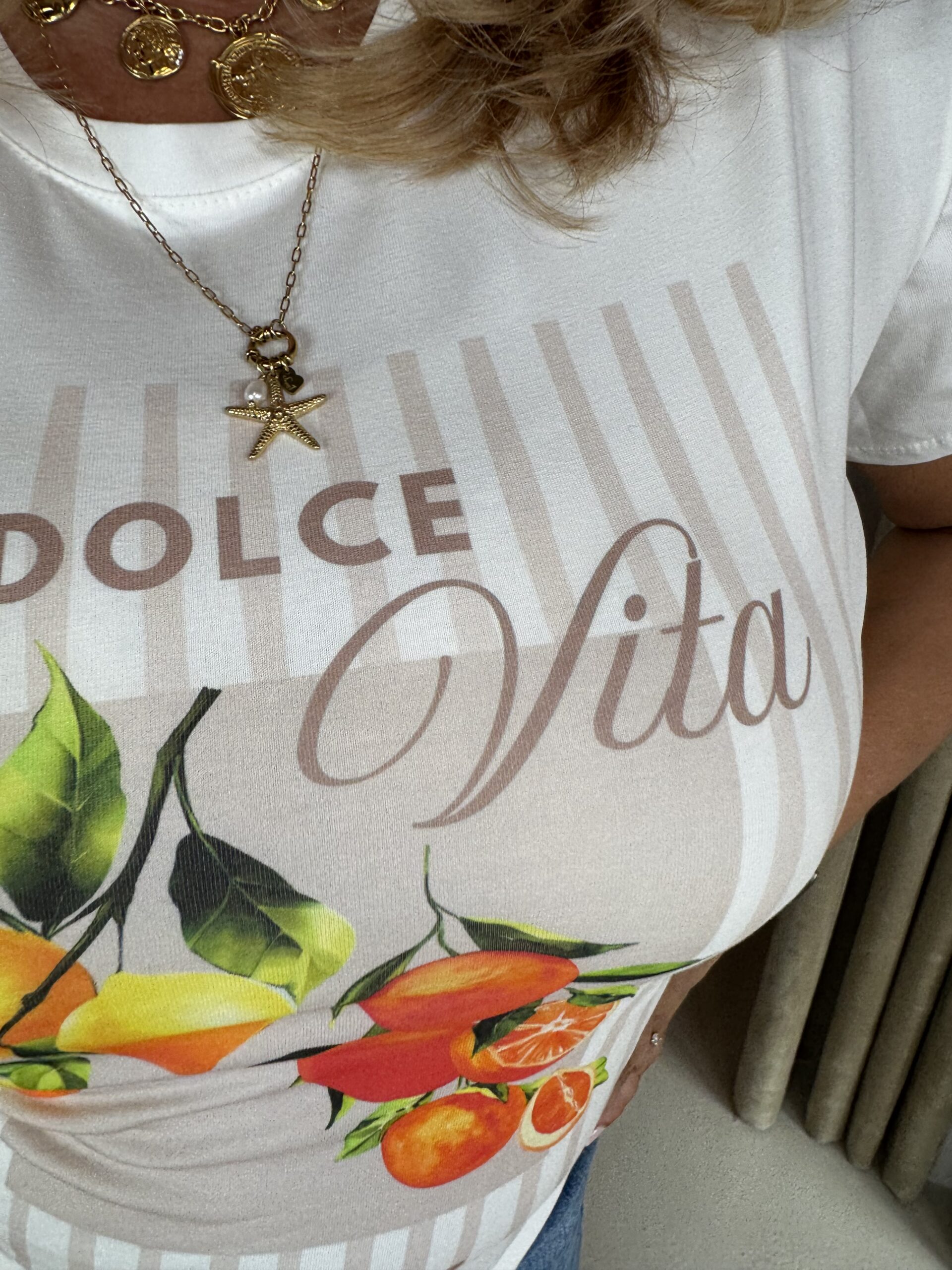 T-Shirt La Dolce Vita 24023-56 Zand Opdruk is een basic t-shirt met een vrolijke opdruk