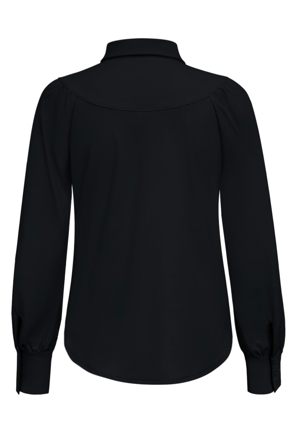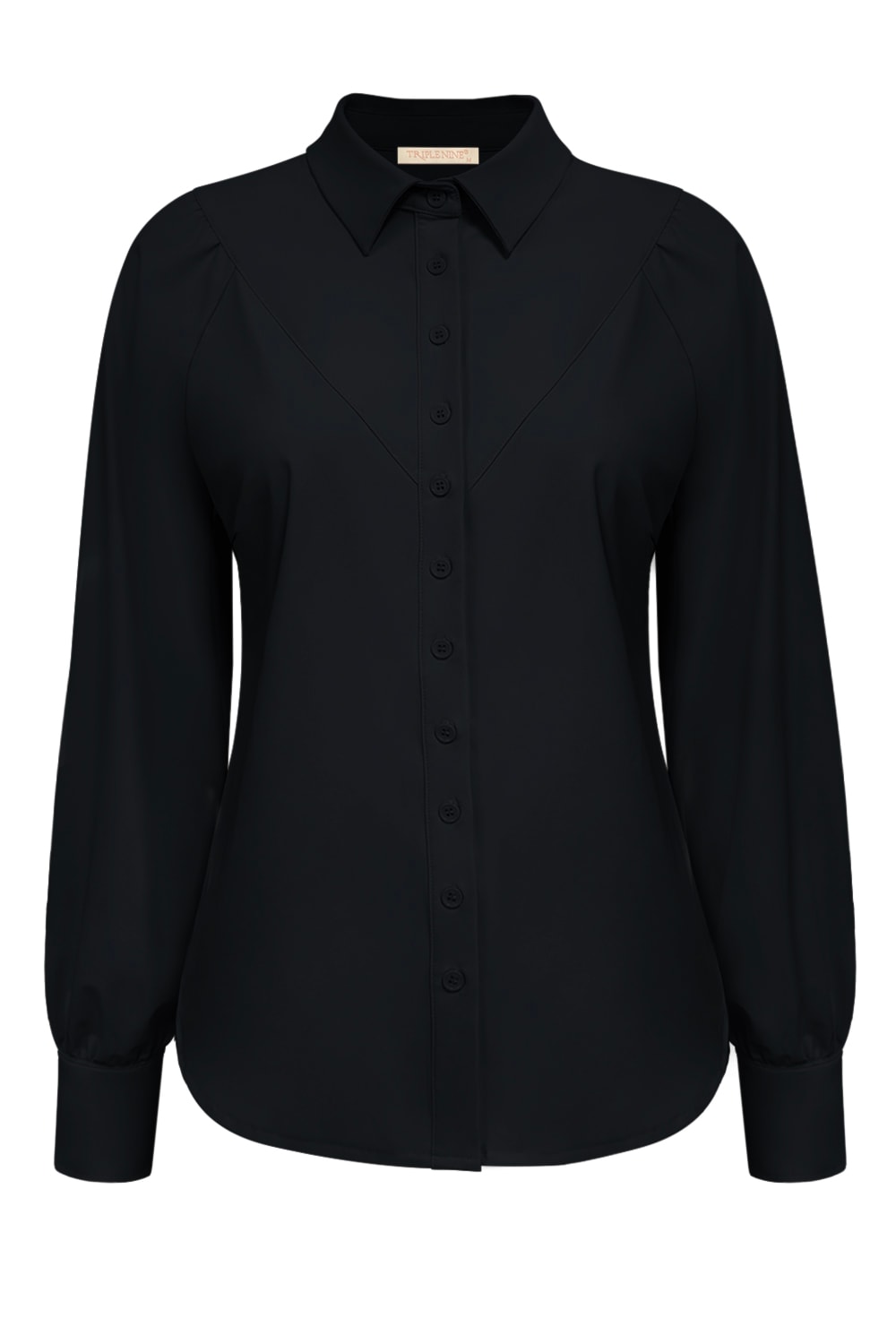 Deze mooie Triple Nine Travelstof Blouse 5919 Zwart van het merk Triple Nine is mooi getailleerd, heeft leuke plooitjes op de schouder, een bescheiden ballon mouw en mooie naden op het voor[and in een punt, achter rond