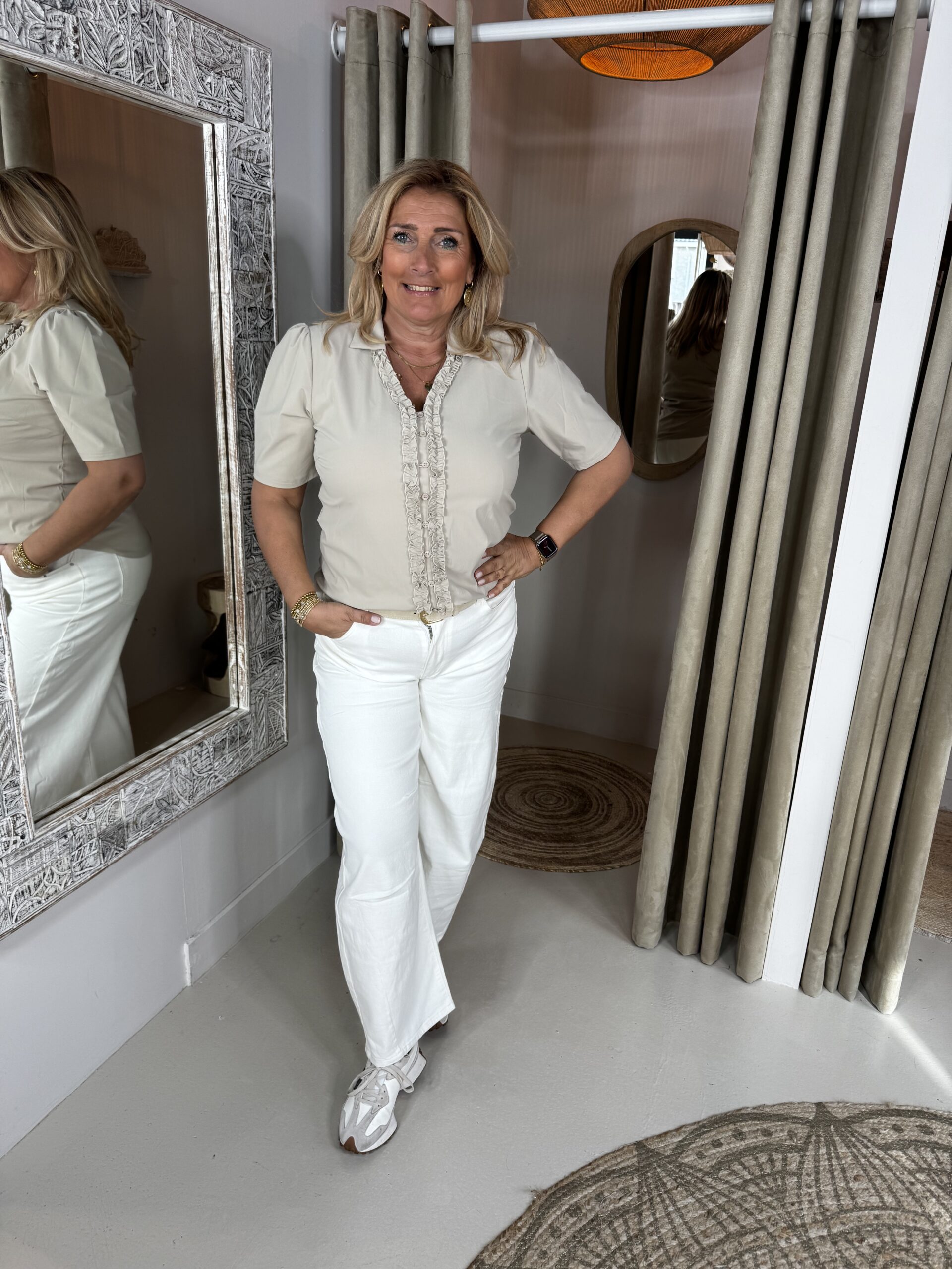 Monique draagt maat 44, is 174 en draagt van deze blouse de XXL