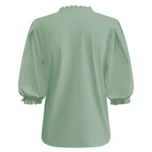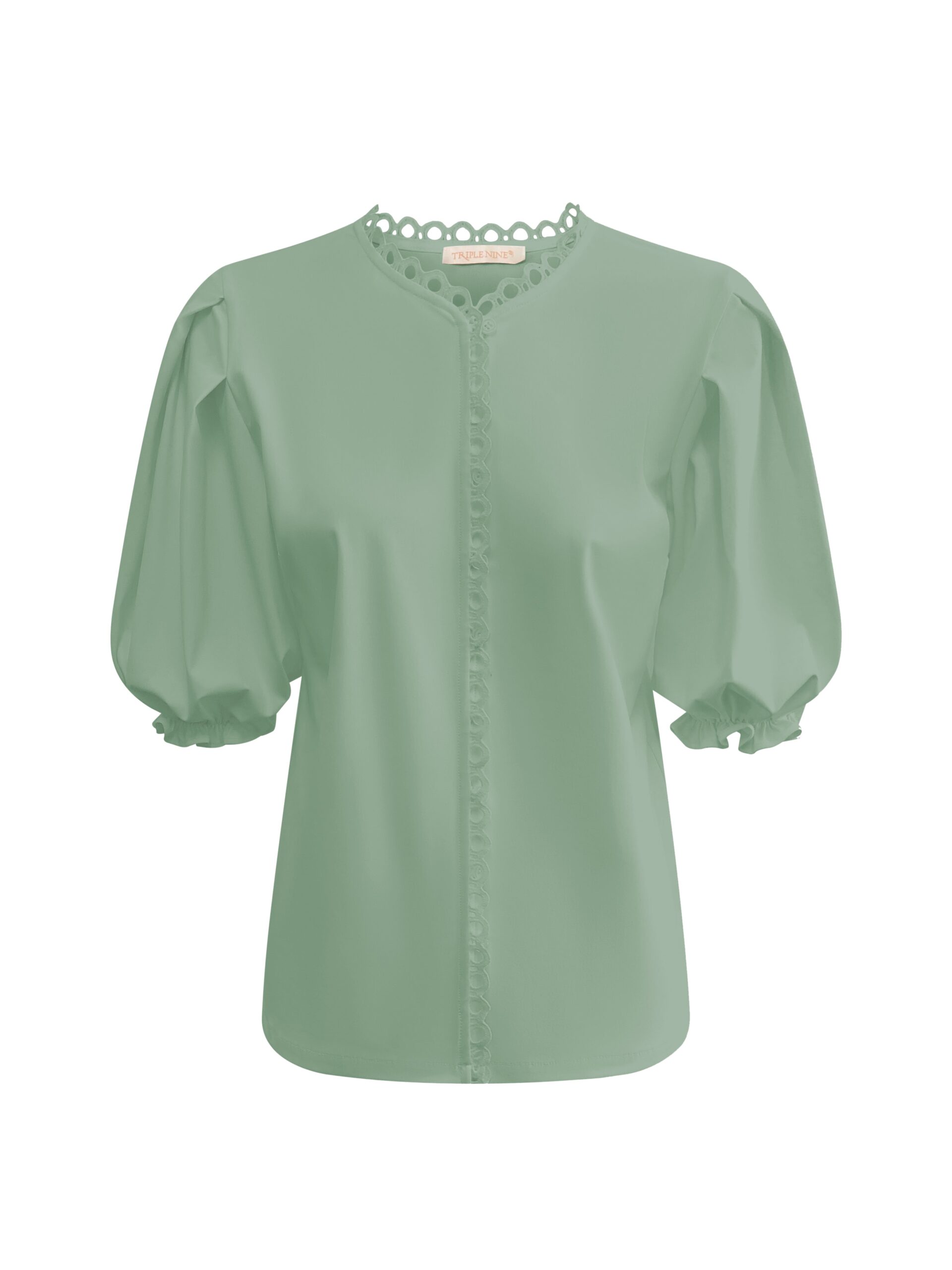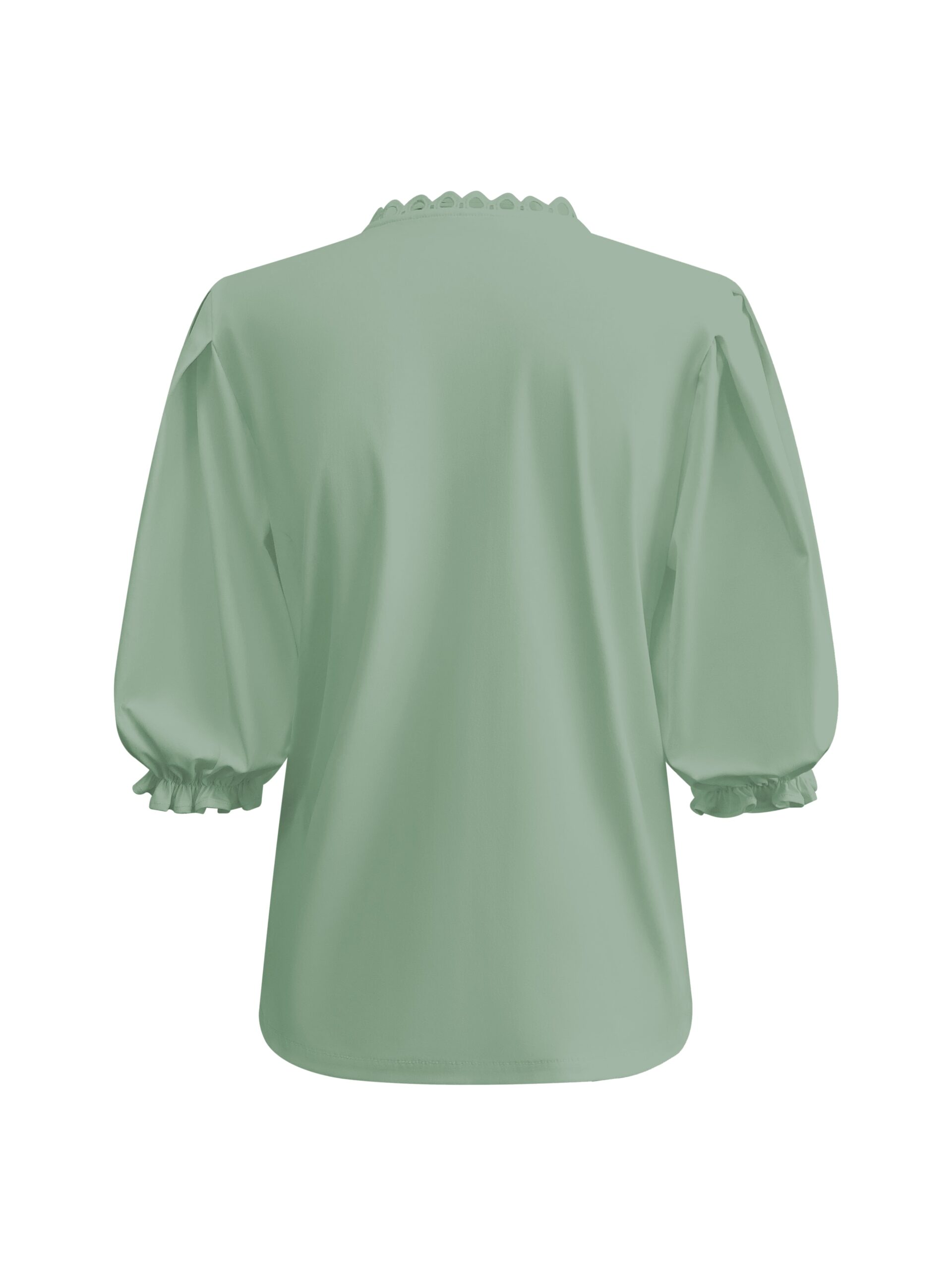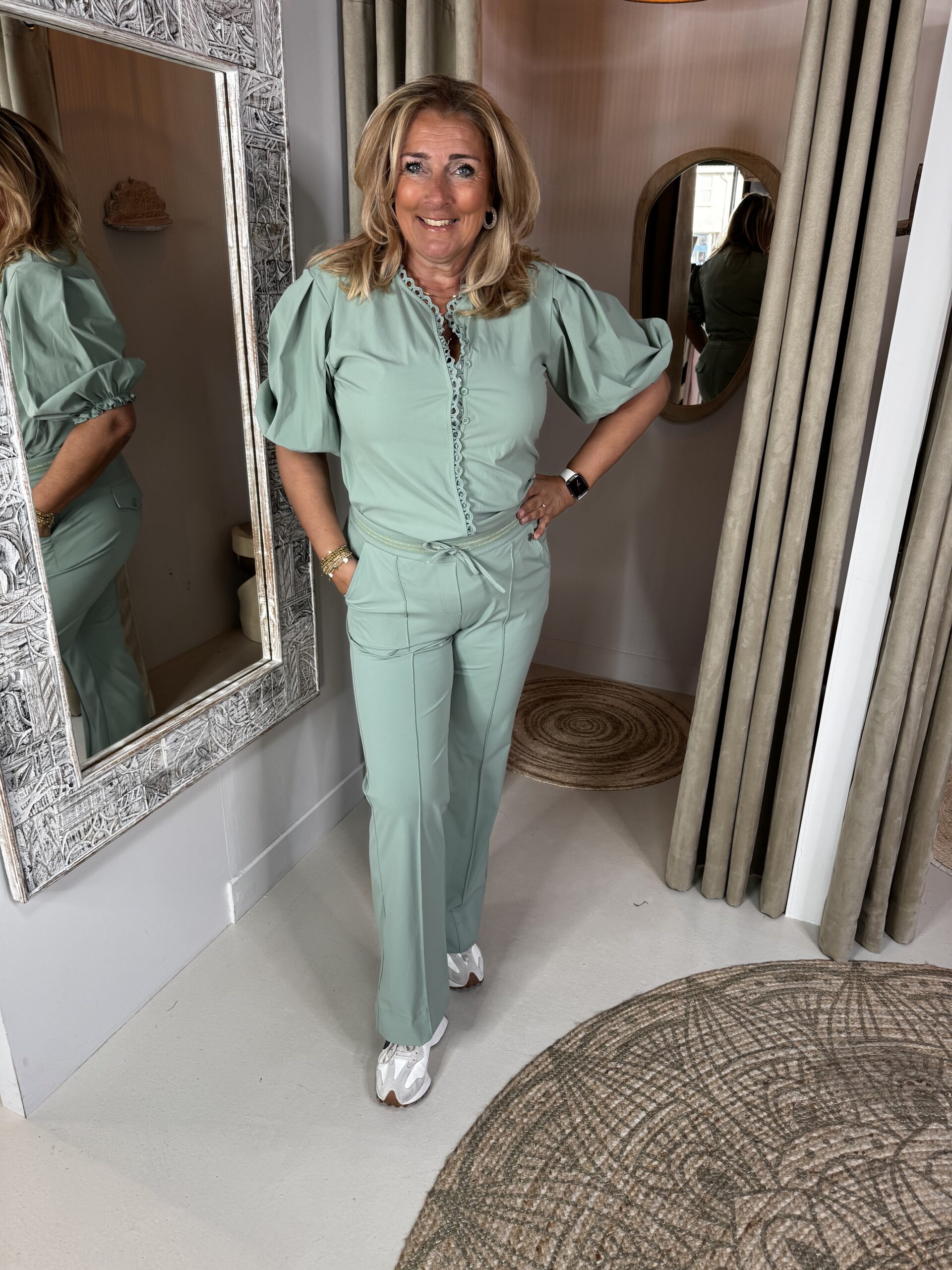 Deze mooie Triple Nine Travelstof Blouse 5935 Sage van het merk Triple Nine is heel mooi uitgewerkt met heel mooi kant langs de sluiting en schattige knoopjes