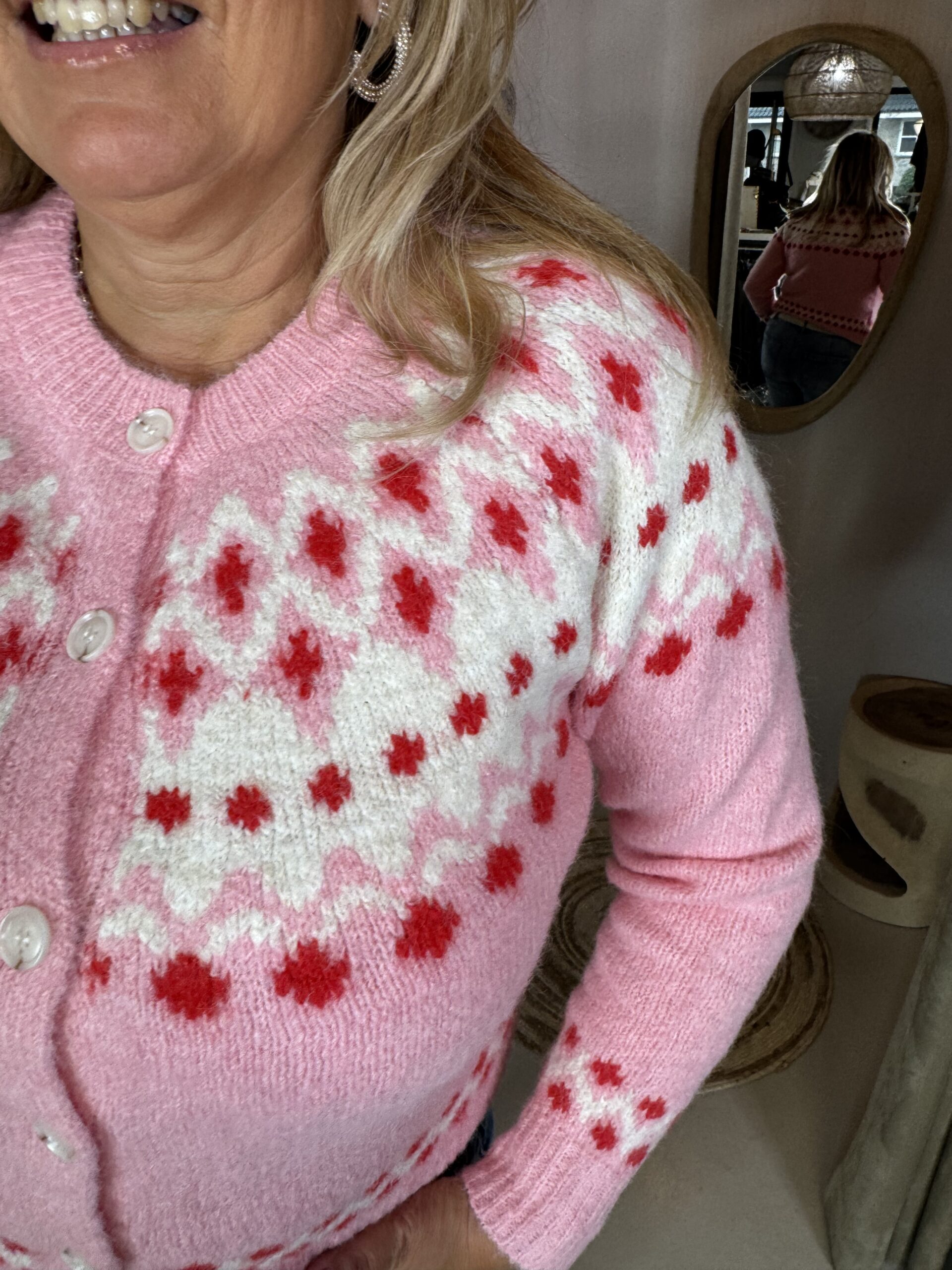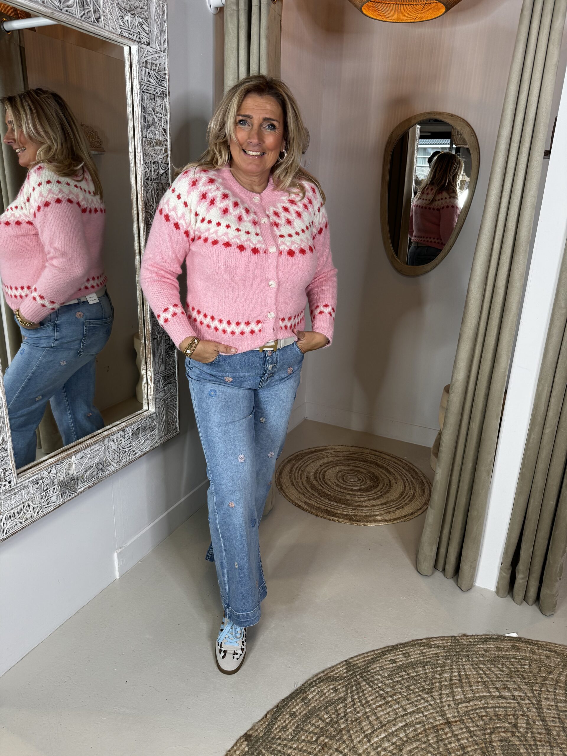 Trui Astera 2001 Roze is gemaakt van een zacht breisel en heeft een mooie noorse print in pastel kleuren