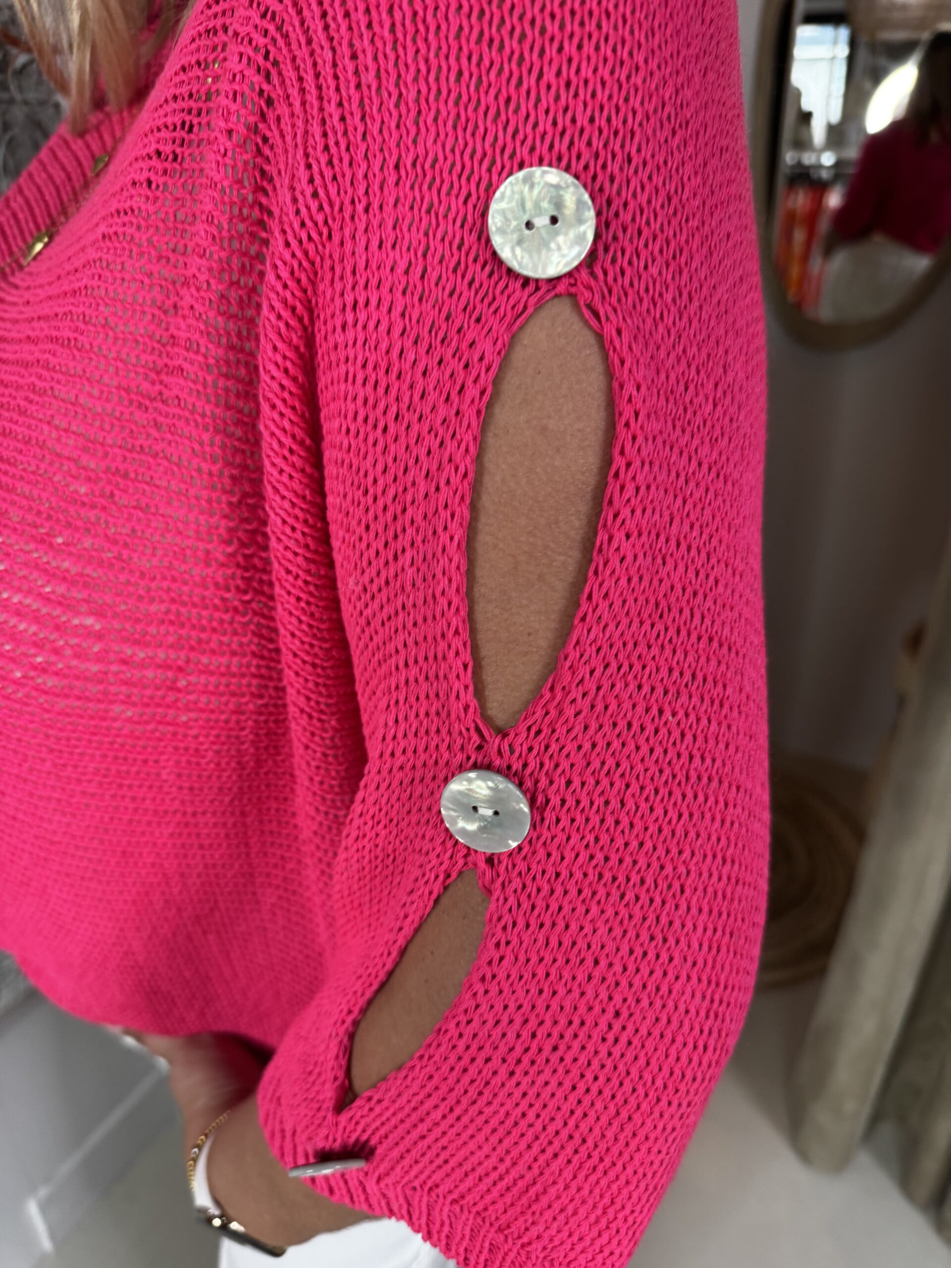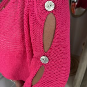 Deze leuke voorjaars/zomertrui heeft leukeopen “gaten”op de armen met voor de sier een knoop erop