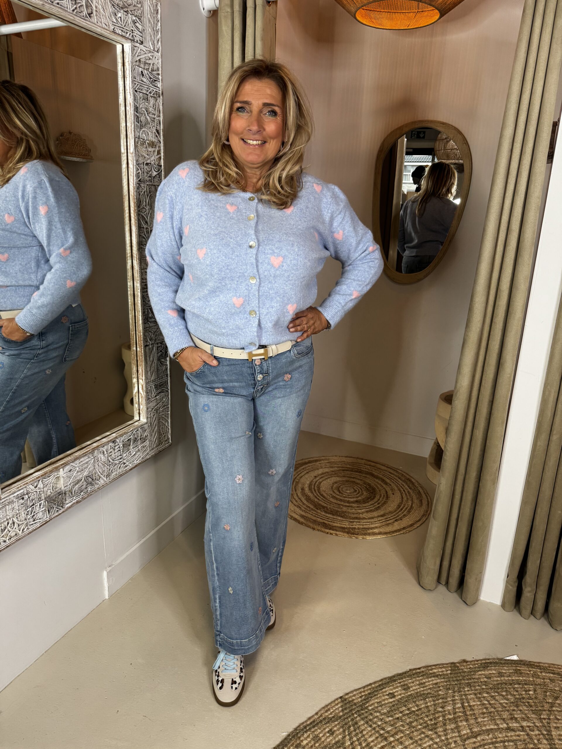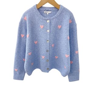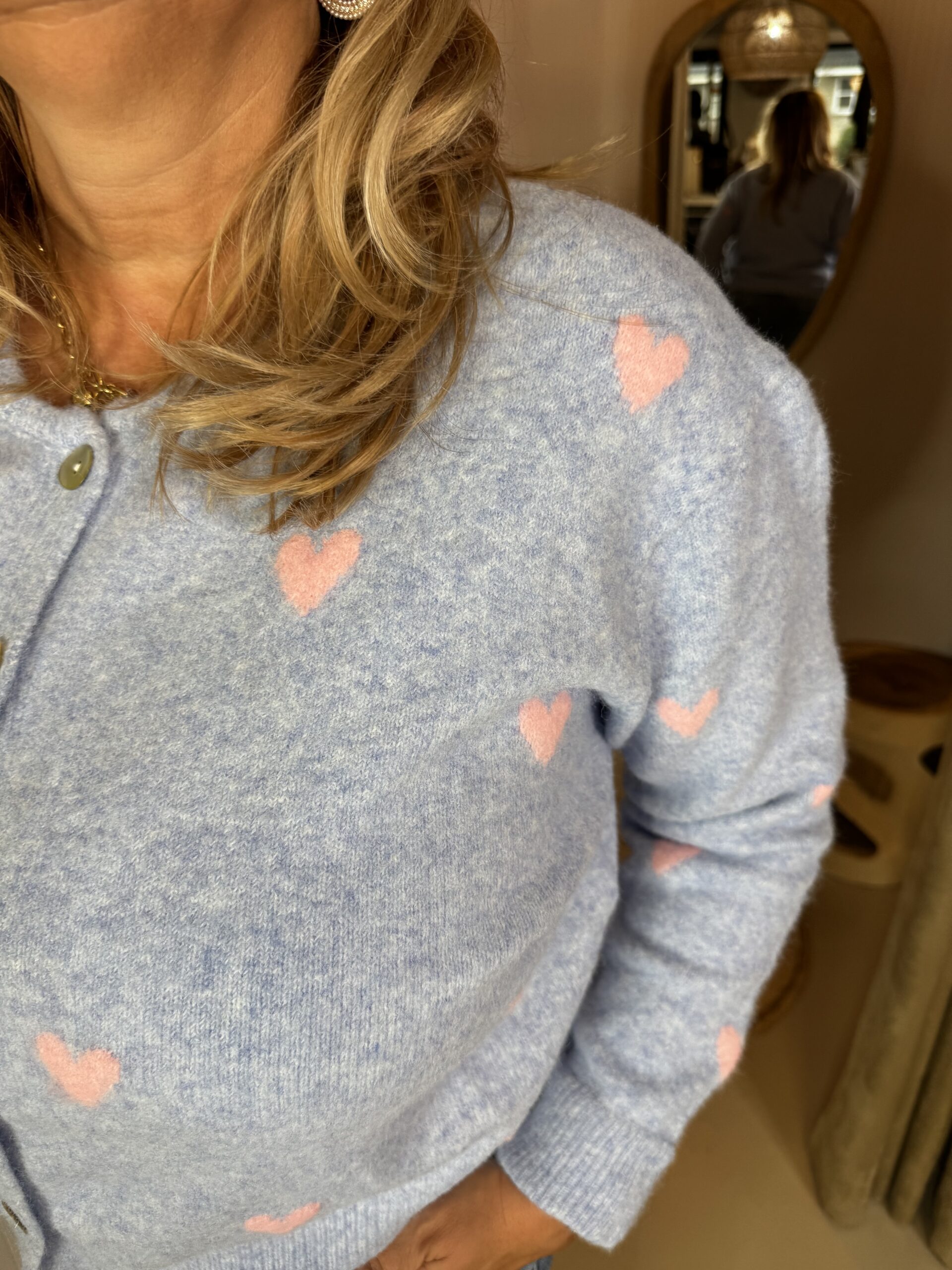 Vest Amelie 1905 Hartjes Blauw is gemaakt van een zacht breisel en heeft hartjes over het voorpand verdeeld