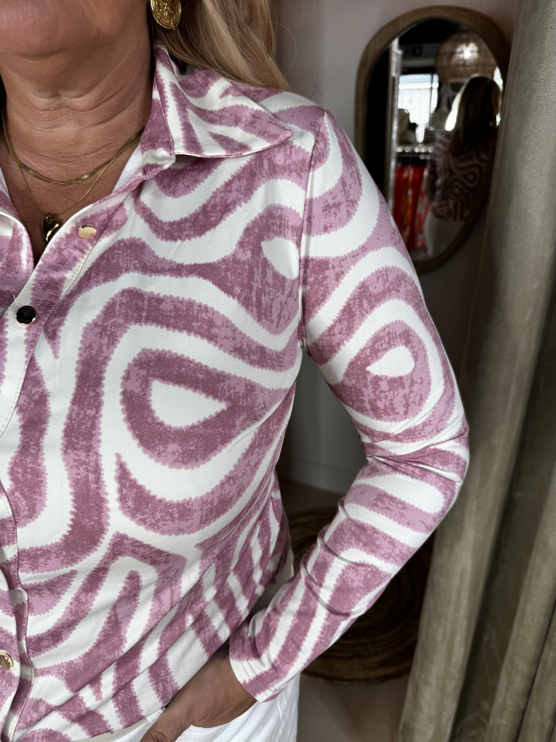 Hij heeft een blouse-kraag en een leuke print en sluit met gouden knoopjes